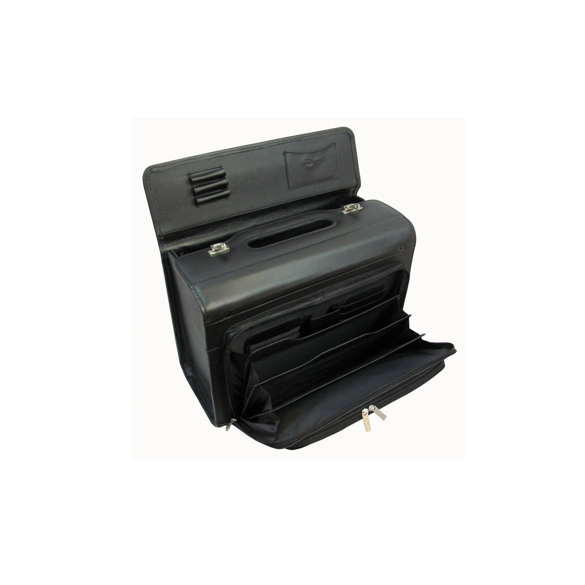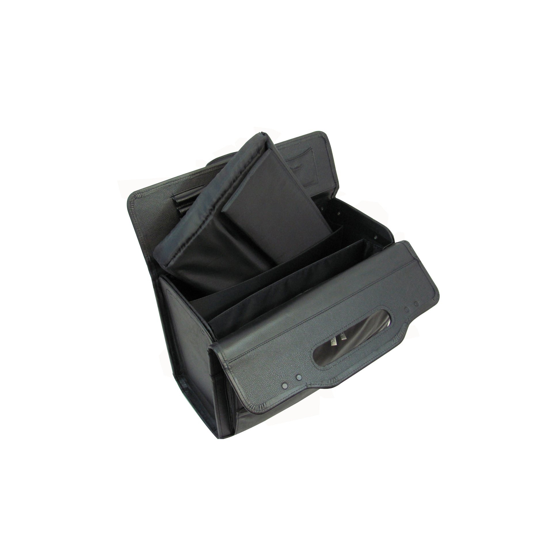 Inside, you’ll find a padded sleeve that fits laptops up to 14", two flexible divider panels, and ample space for documents or binders. A zip-down organizer panel includes card slots, pen loops, disk holders, and a three-tier accordion file. Twin nickel-finish combo locks and a front zippered pocket make this catalog case a secure and efficient choice for business travel.
