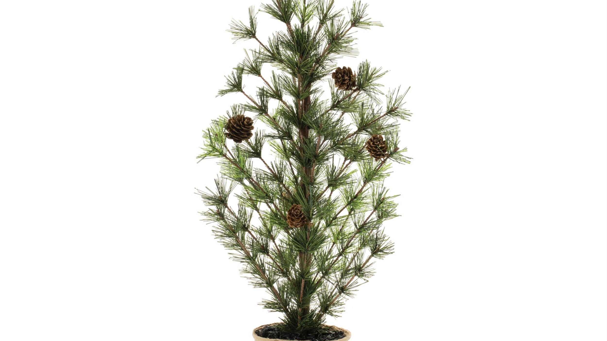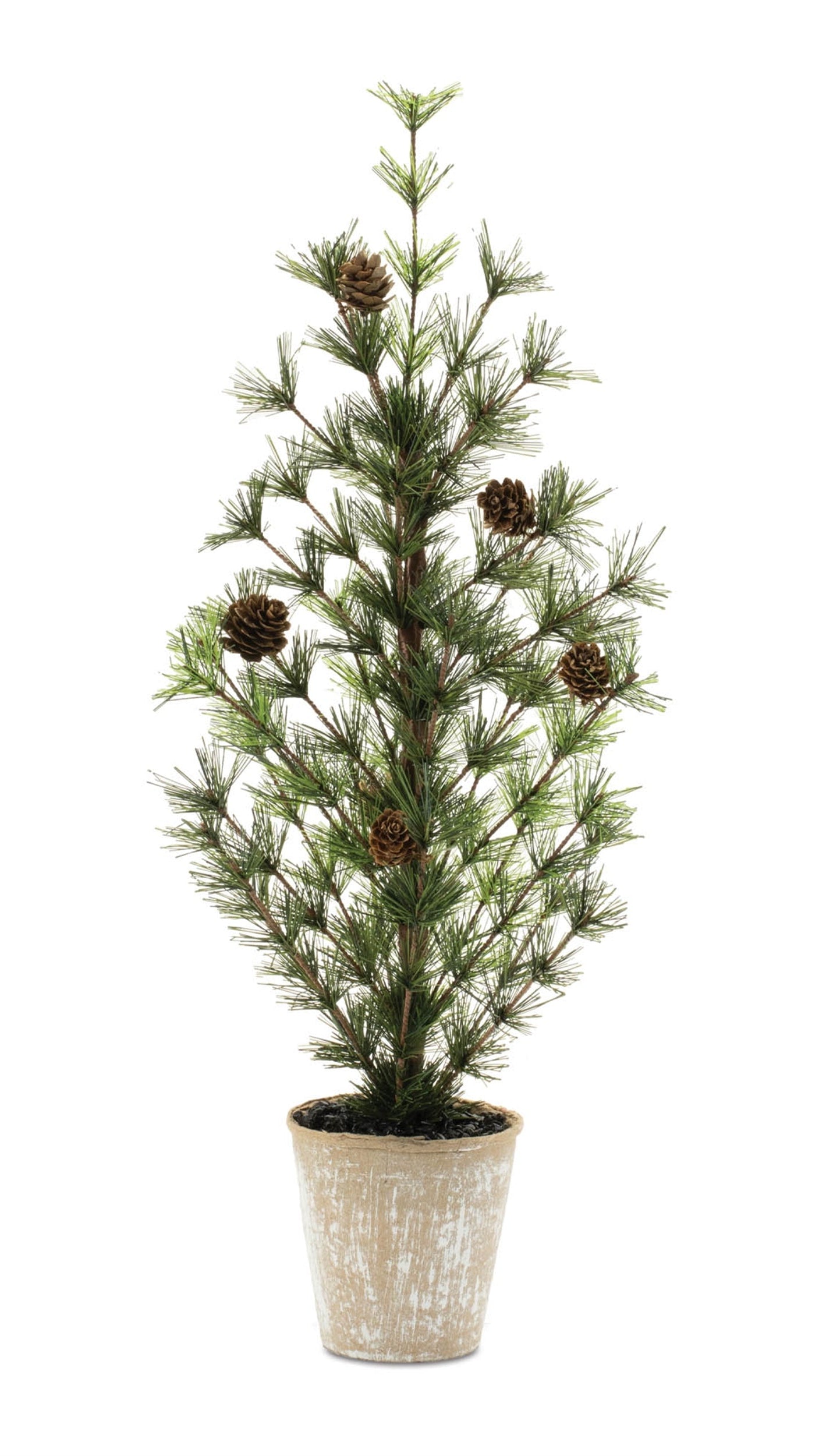 The potted mini pine tree adds classic holiday greenery to indoor seasonal décor. Designed with faux pine branches in earthy green tones, this artificial tree features wired branches for easy shaping and natural pinecone accents for a realistic finish. Set in a whitewashed planter base, it blends seamlessly with farmhouse, rustic, or modern holiday styles. Ideal for entryways, mantels, shelves, or tabletop displays, this compact tree provides festive charm without maintenance. Crafted from plastic with iron support, it is intended for indoor use only. Measures 10" W x 10" D x 24" H, making it a versatile accent for smaller spaces.