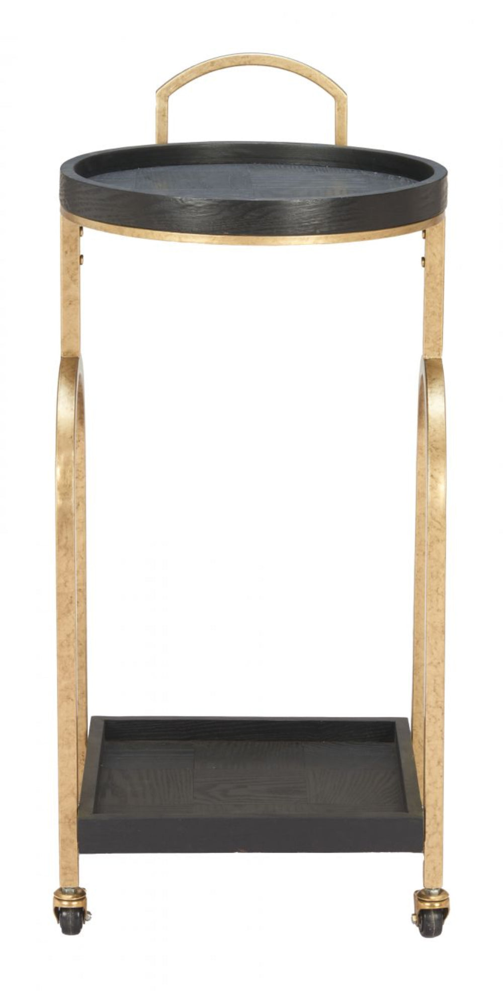 Bring refined elegance and function to your entertaining space with the Zukei Bar Cart in Black by Zuo Modern. Crafted from rich oak wood and durable steel, this modern round bar cart offers an artful balance of sophistication and practicality. The two-tier circular design provides ample space for storing or serving beverages, while its sleek black shelves and gold frame create a timeless contemporary look. Perfect for living rooms, kitchens, or hospitality settings, the Zukei Bar Cart delivers versatility, convenience, and style wherever you roll it.