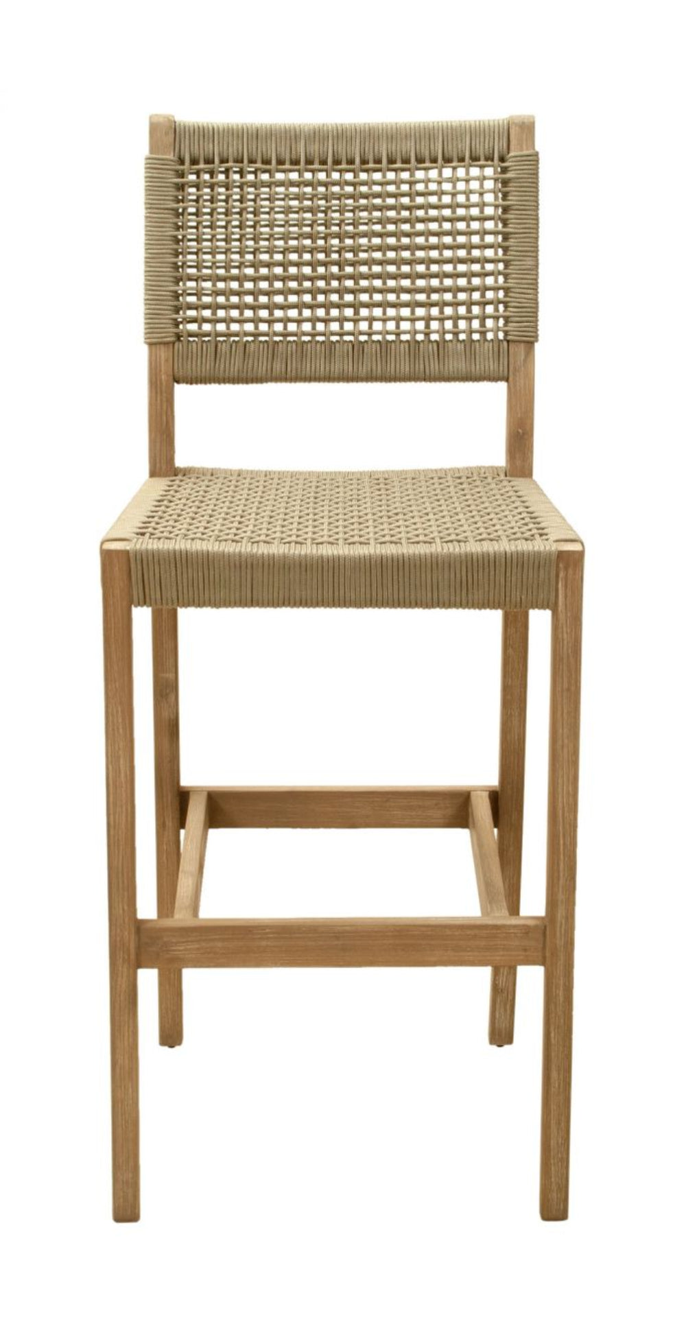 Elevate your outdoor seating with the Corde Barstool in Beige, combining contemporary design with durable materials. Featuring 100% olefin fabric seating and a solid acacia wood frame with synthetic rattan weave, this barstool provides both comfort and long-lasting quality.
