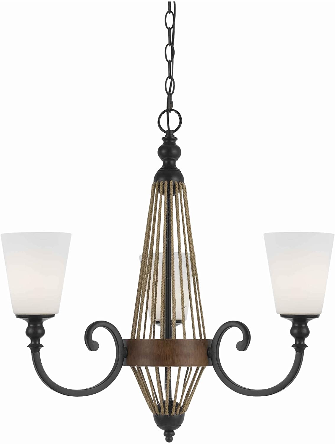 Bless your home with the rays of hope and happiness by bringing in this amazing chandelier. It features a round wooden frame suspended by thin ropes, incorporating scrolled metal holders and smoked glass shades that use 3 bulbs of 60 watt each. It is provided with a 6 feet long chain, granting easy mounting.