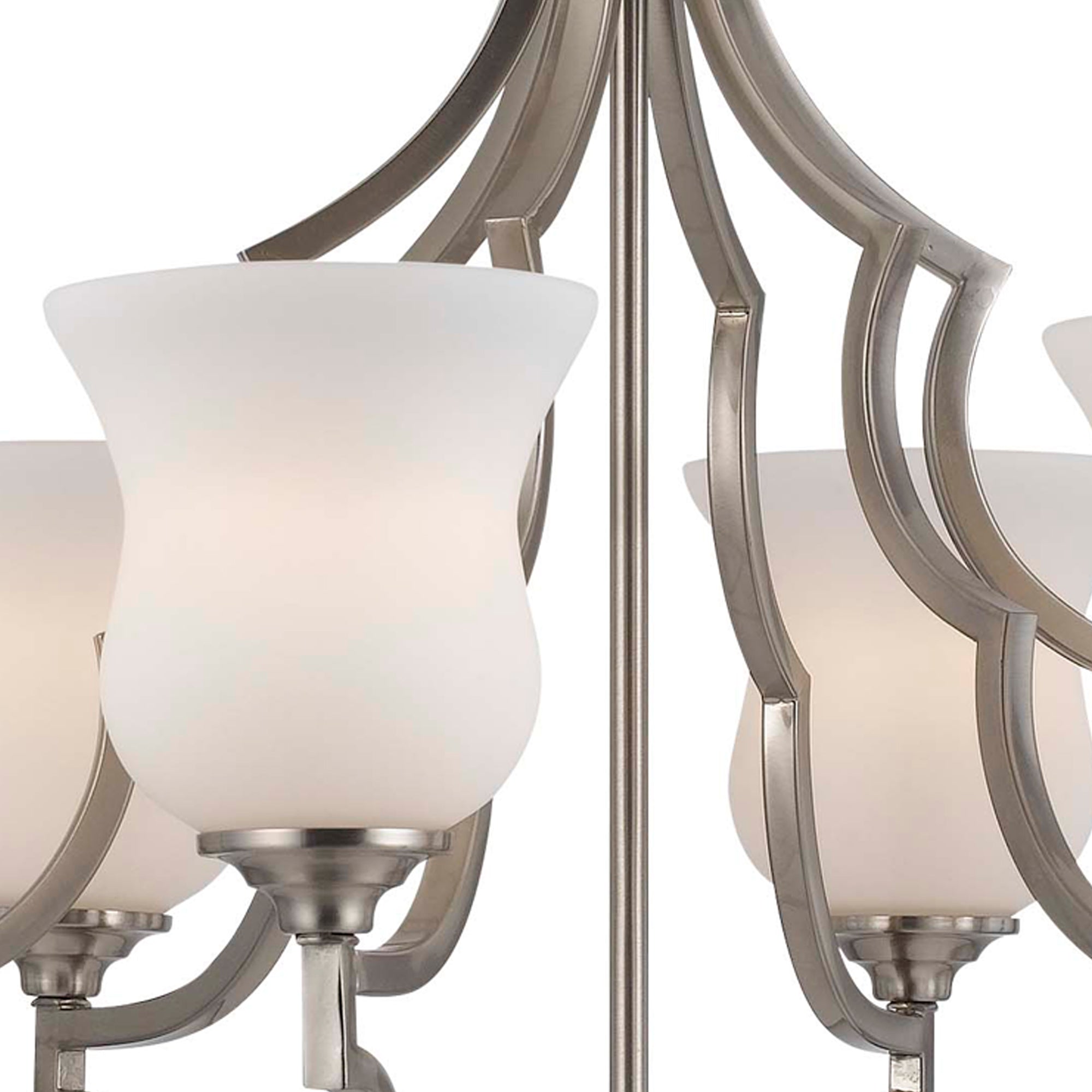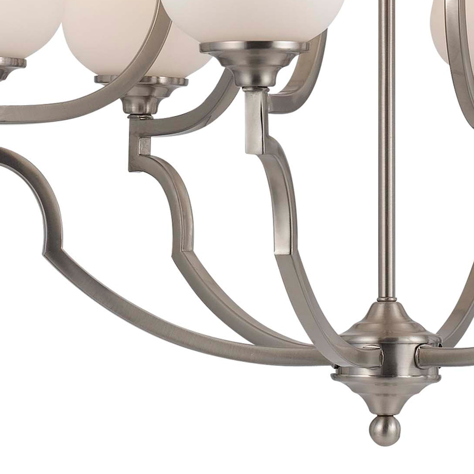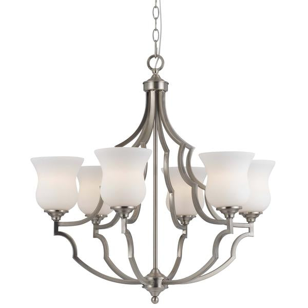 Upgrade the beauty and luxury of your living space by bringing in this elegant and sophisticated chandelier. It features a metal constructed frame in a silver finish with a sleek design, incorporating 6 glass shades in a white finish. It is provided with a 6 feet long chain and 10 feet long wire, providing easy mounting and connection.