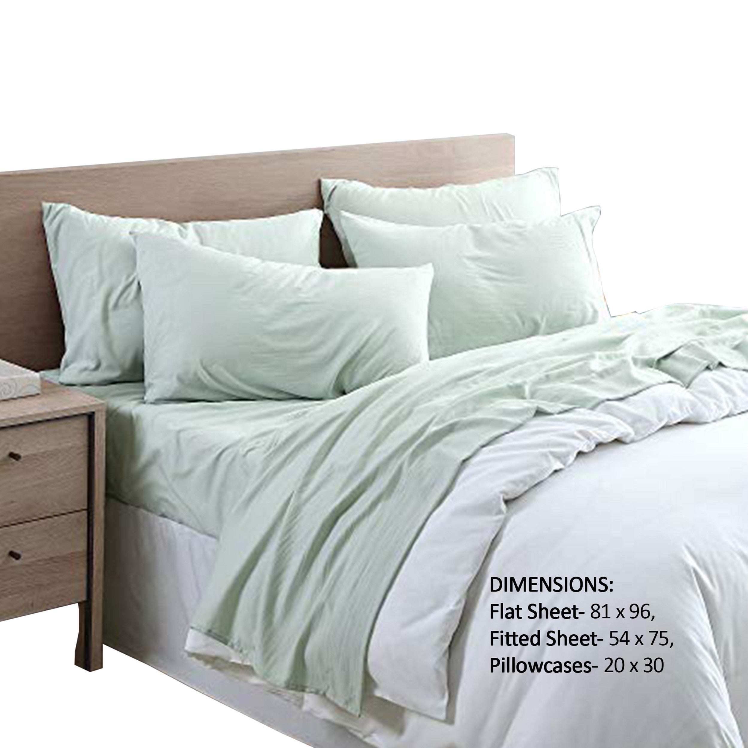 - Dimensions in ``: Flat Sheet- 81 x 96, Fitted Sheet- 54 x 75, Pillowcases- 20 x 30