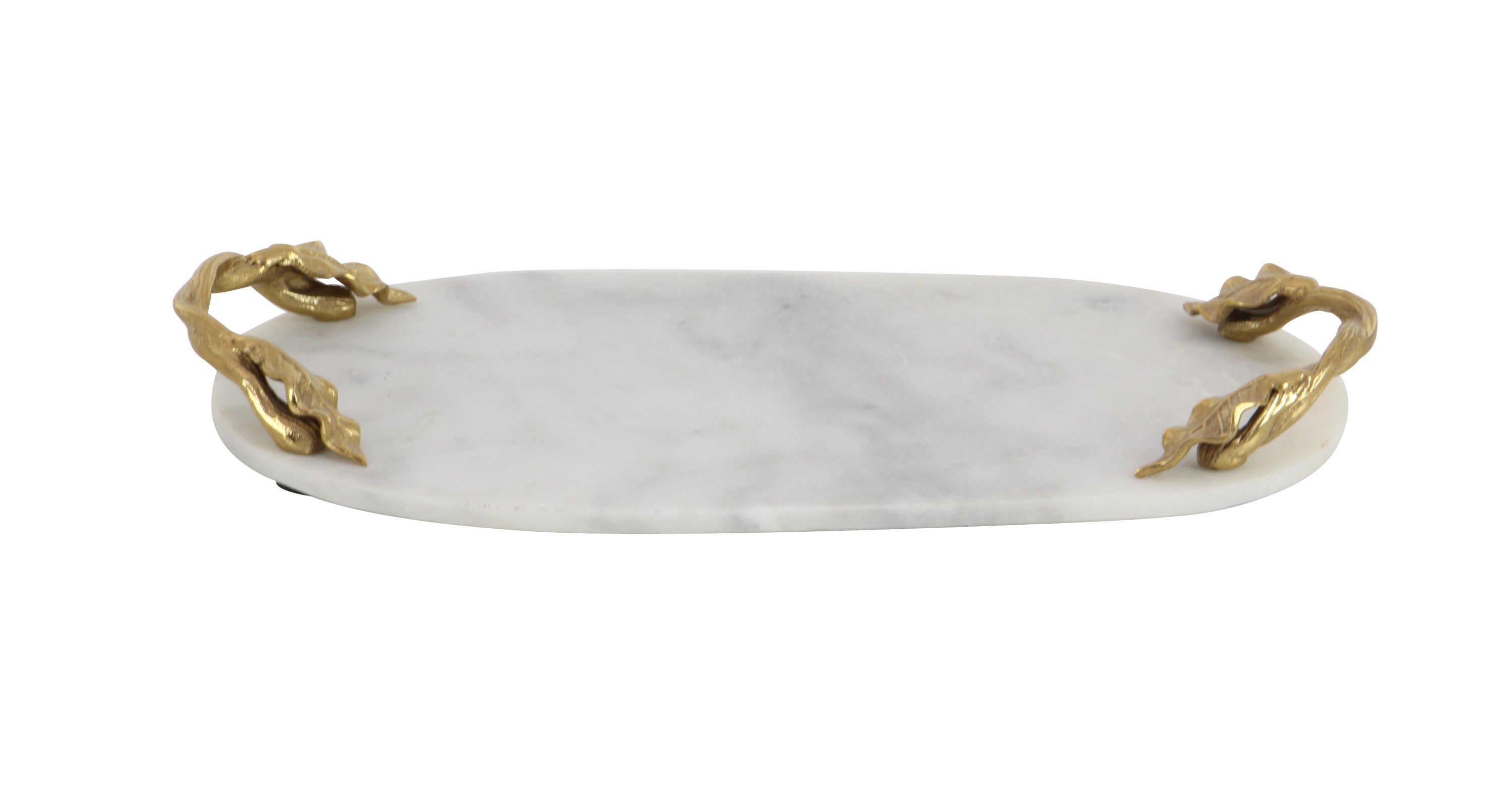 Serve your guests in style with this elegant oval shaped white marble serving tray, featuring sculpted metallic gold leaf metal handles. The solid marble slab is predominantly white with fluid light gray and pale gold veining. The sturdy aluminum handles makes for effortless carrying while adding an antique style accent.