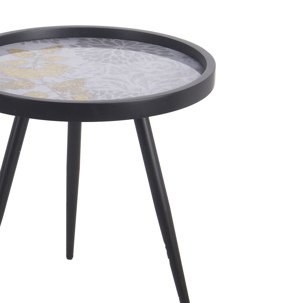 Benzara BM217018 Metal Accent Table with Floral Pattern Round Tray Top, Set of 2, Black