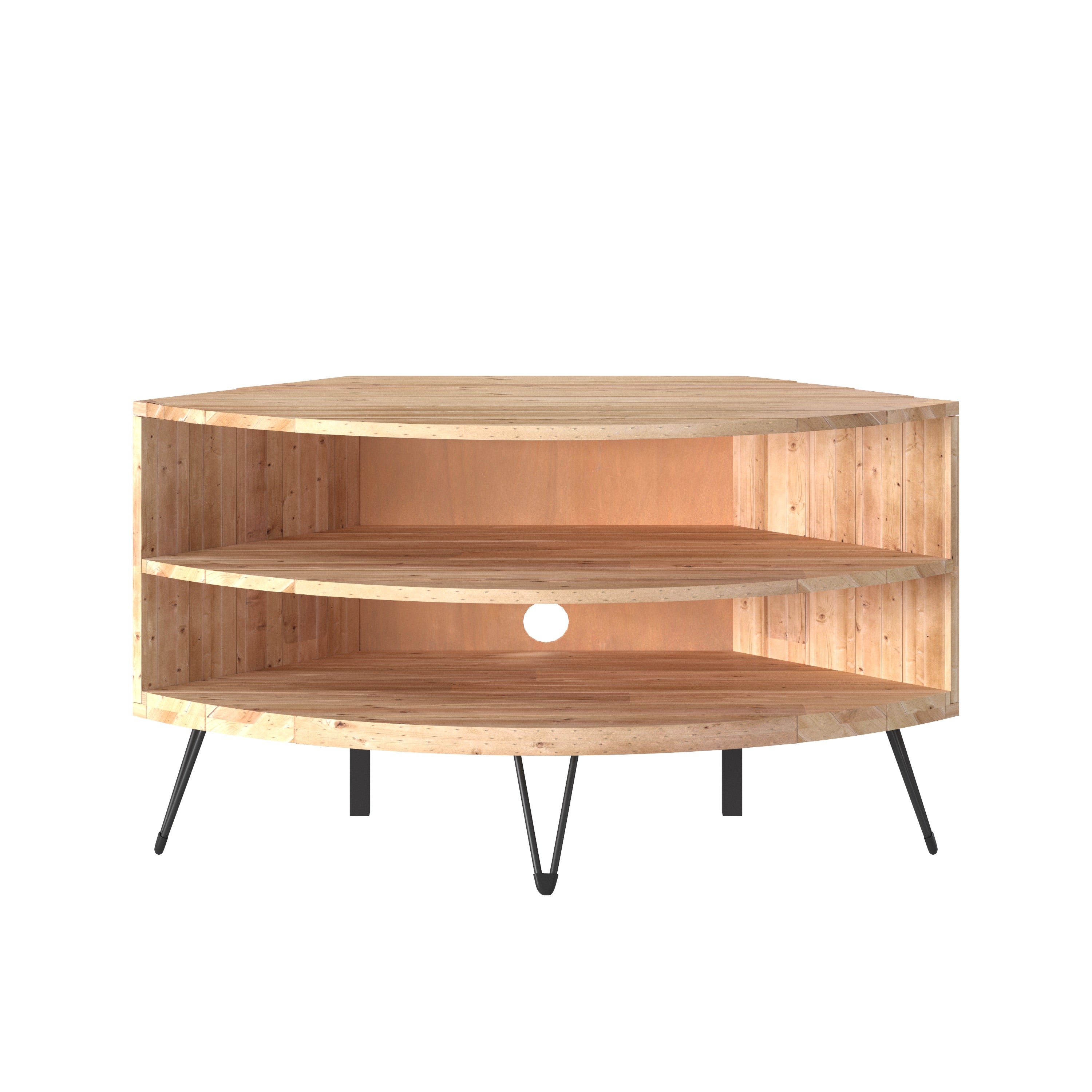 Provide all your media gadgets a sophisticated abode by bringing in this contemporary style Corner Media Stand which offers spacious storage with its 2 open shelves. Supported on metal hair pin and straight legs, it is constructed from solid reclaimed wood.