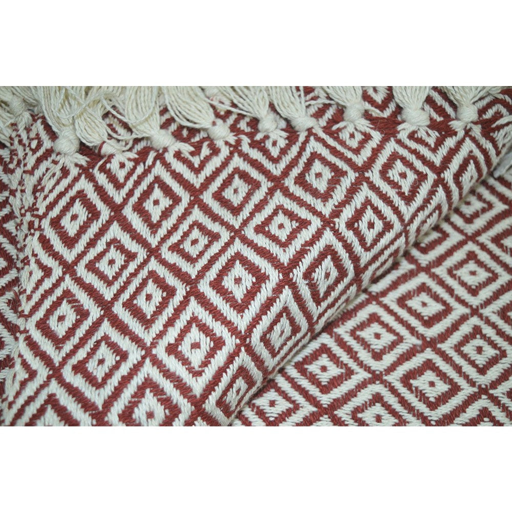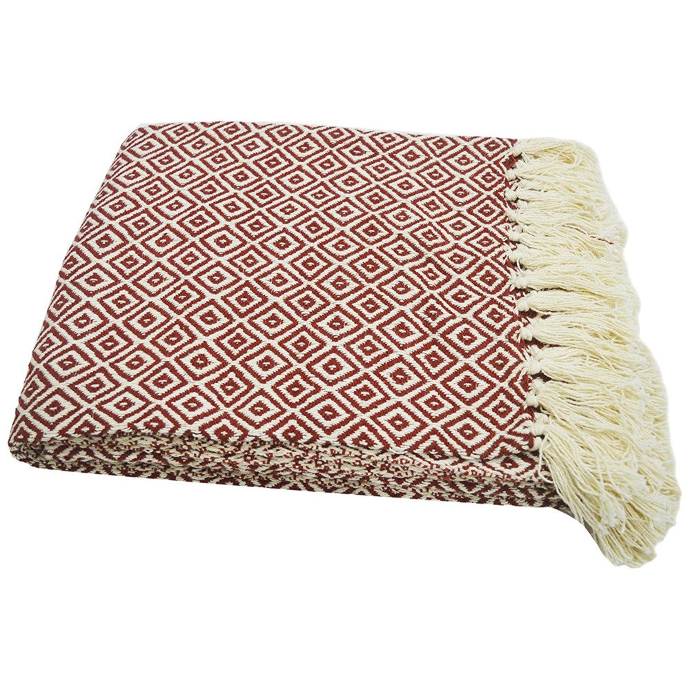 Benzara Diamond Pattern Cotton Throw with Fringed Ends, Rust Ivory