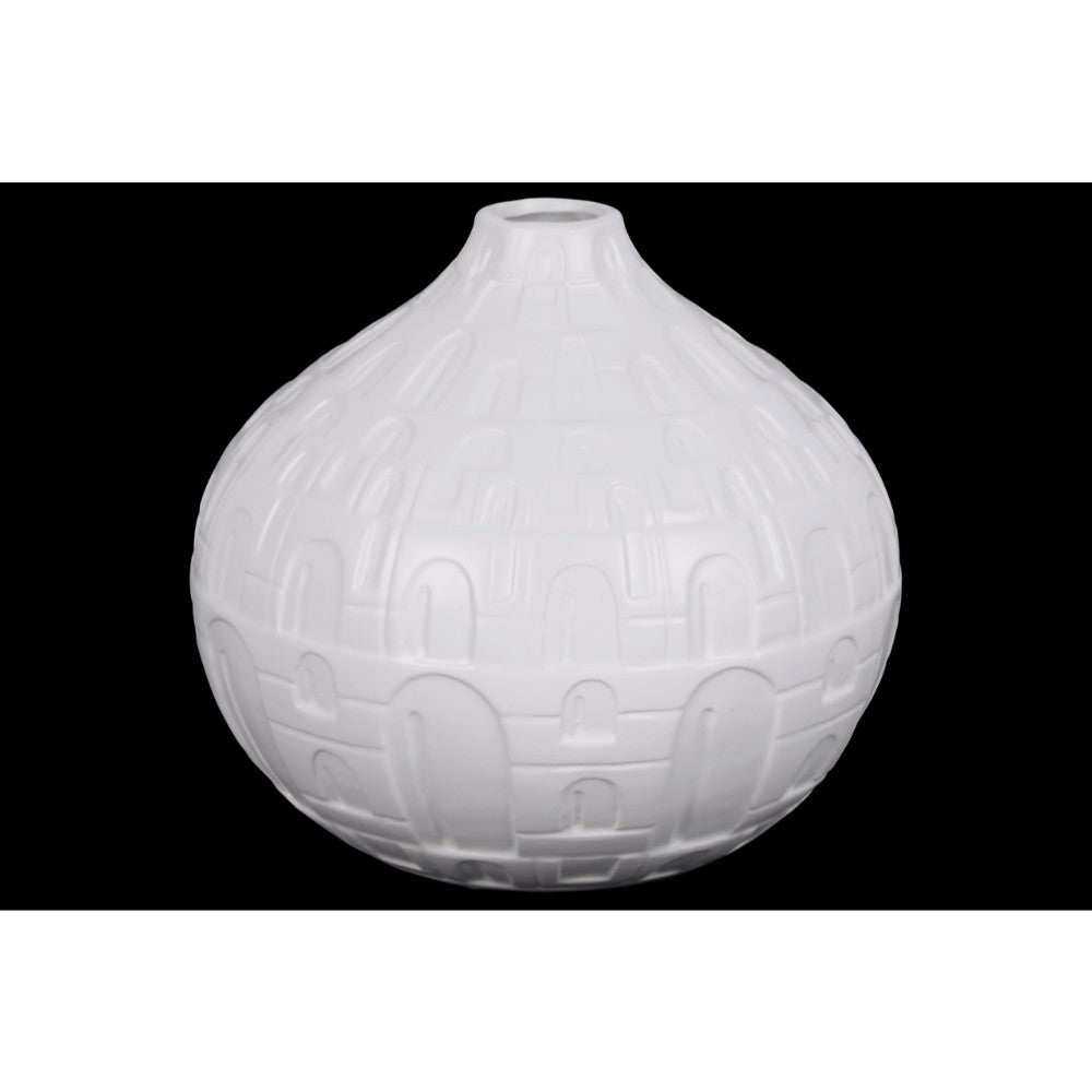 Beautify the ambience of your home with this tremendous ceramic vase with a bellied structure. This ceramic vase has a matte white finish, adding elegance to its appearance. It features an engraved lattice oblong design body, a small mouth that gives a traditional look to your home interior.
