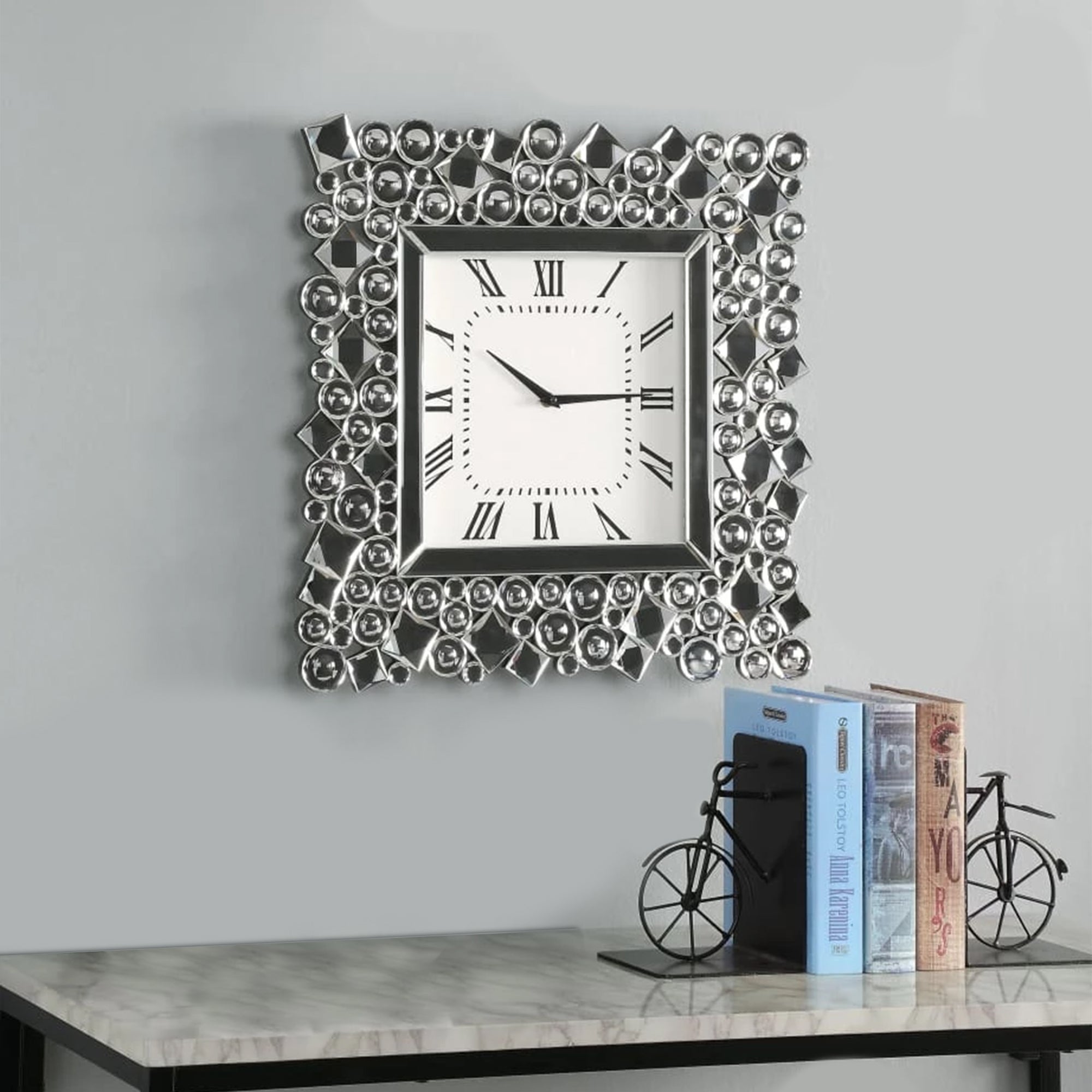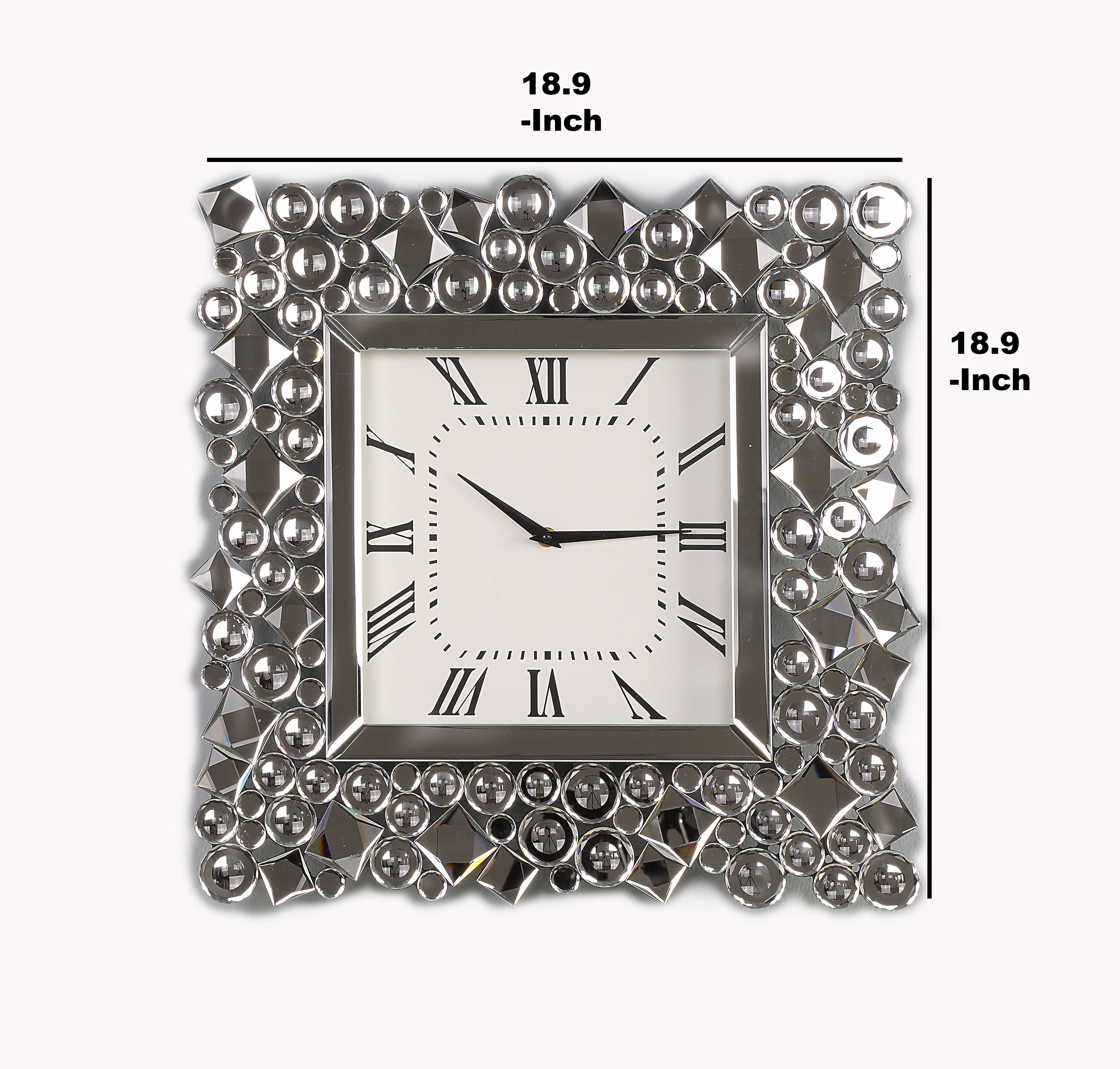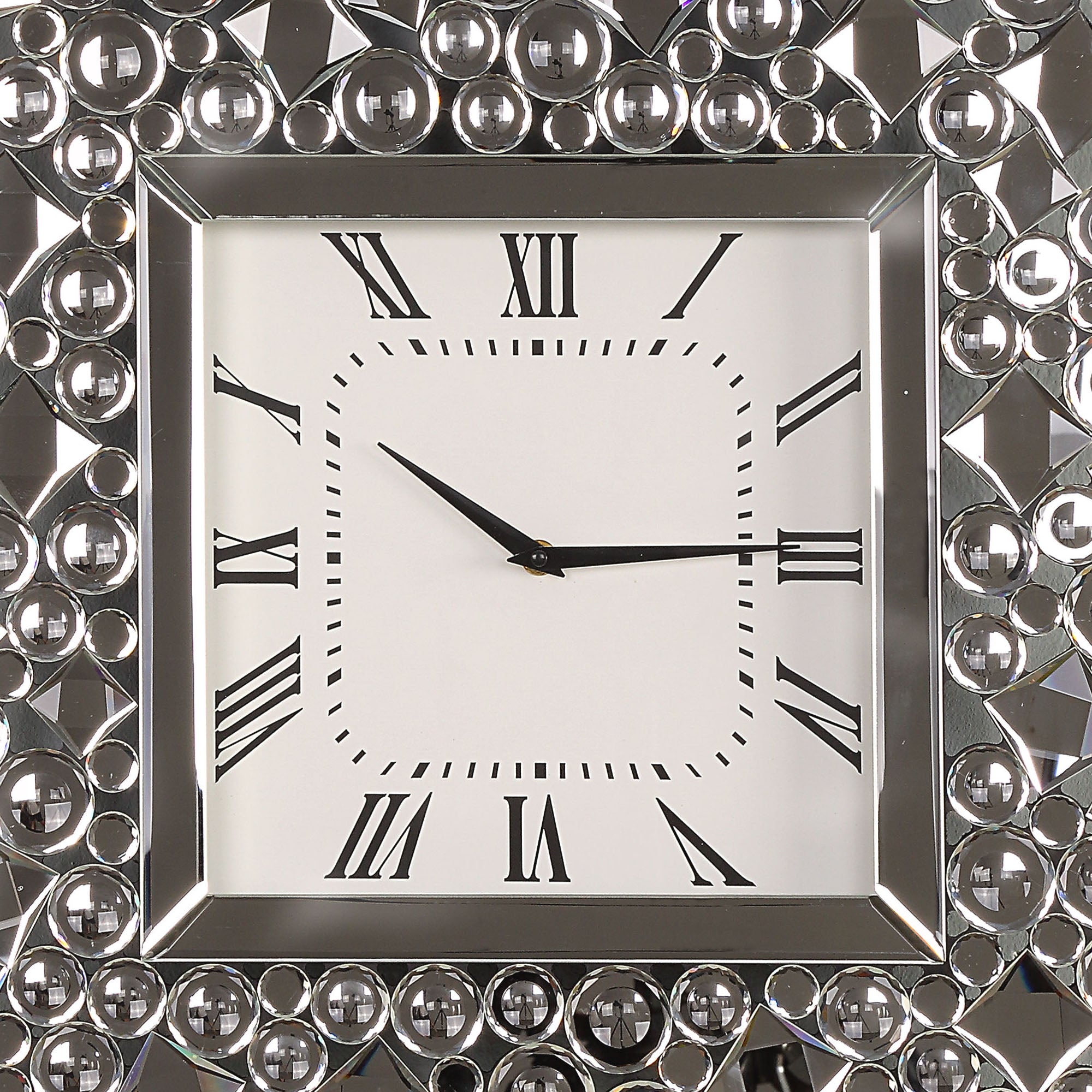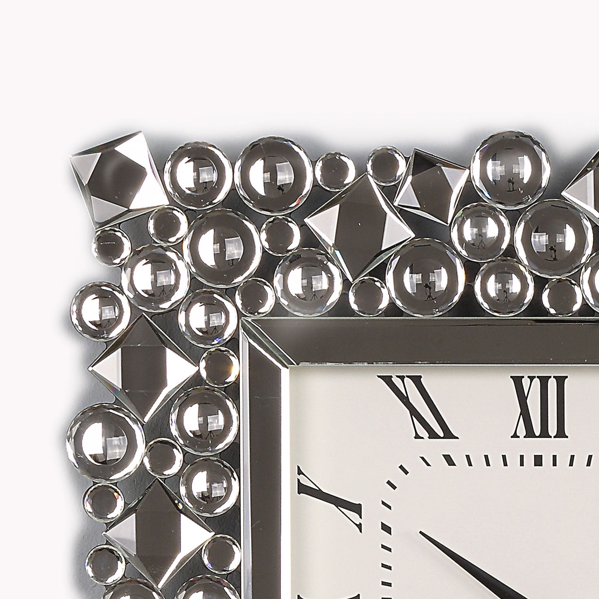 While elegantly reflecting its surroundings, this Wall Clock combines glamour with modernism. This square wall clock features a square face with vintage style Roman numerals and black metal hands. Bordered by beveled mirrored panels that naturally draw the eye, the durable Composite Wood frame of this clock is tiled with faux crystal gems in round and diamond shapes. Add this clock to your empty wall and be sure to grab attention of your guests. Note: Other featured items in image except this wall clock are sold separately.