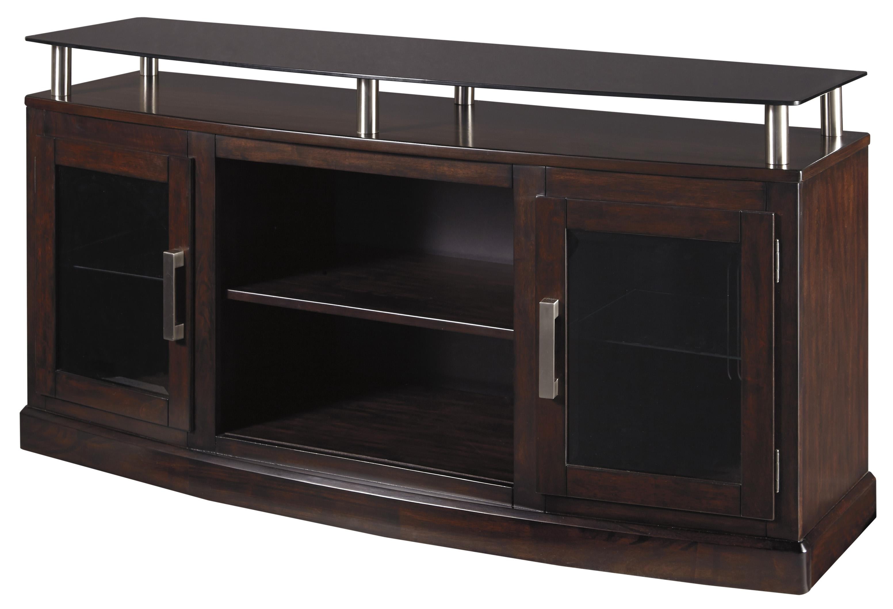 Mordenize your living sapce with the inclusion of this amazing TV Stand with Raised glass top with tubular metal support. Constructed from the combination of engineered wood and solid wood, It features 2 glass doors with 1 shelf and an adjustable lower center shelf.