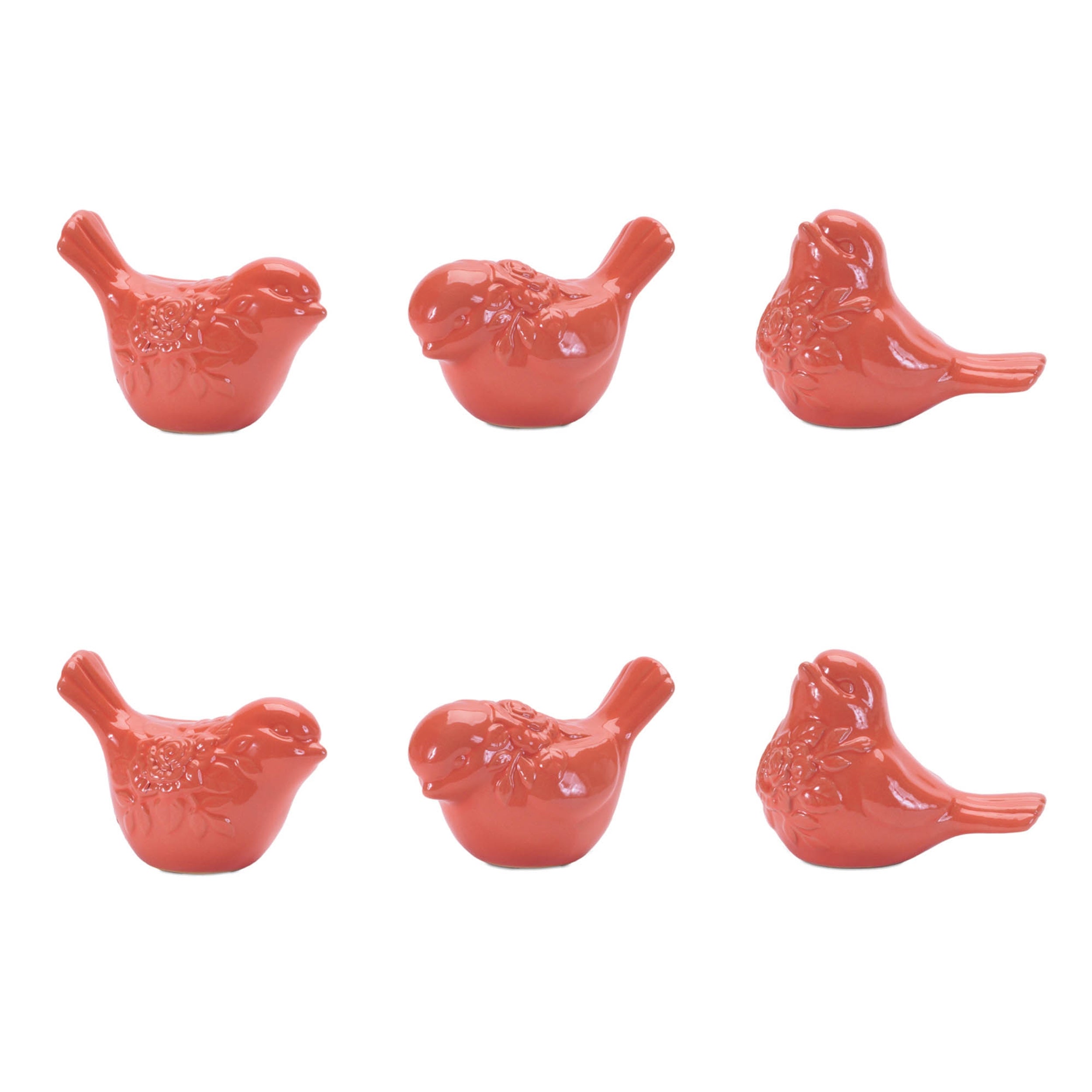 This pink ceramic floral bird figurine set includes six decorative birds in three assorted designs for tabletop, shelf, or mantel display. Each figurine features floral detailing with a smooth glazed finish that adds color and visual interest to indoor spaces. The compact size makes them ideal for bookshelves, side tables, or layered decorative arrangements. Crafted from durable ceramic, these birds are designed for indoor use and offer a balanced combination of charm and structure. The set includes figurines measuring 4.5"L x 2.75"W x 3"H, 4.75"L x 2.75"W x 3.25"H, and 4.25"L x 2.75"W x 3.25"H. Perfect for adding a nature-inspired accent to any room.