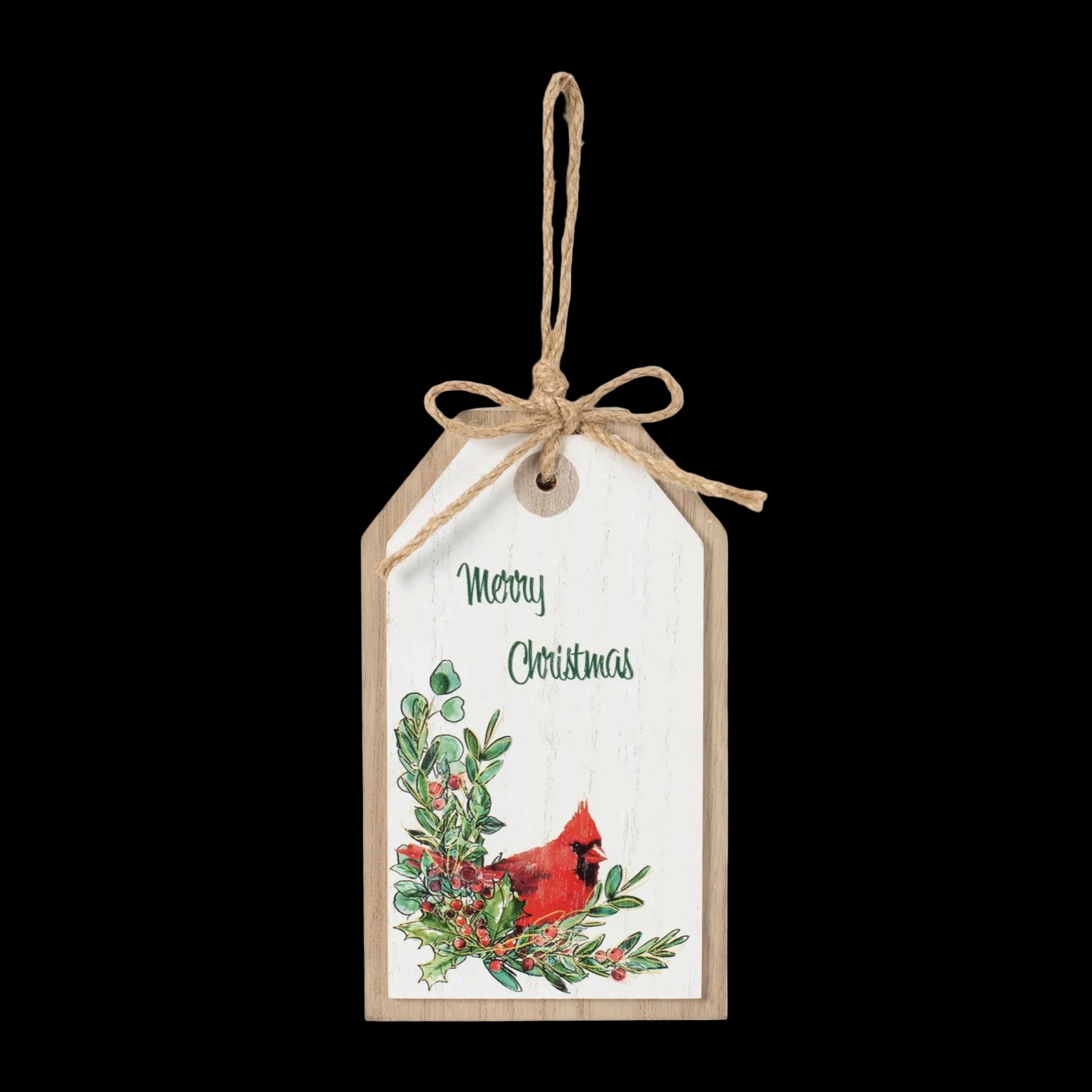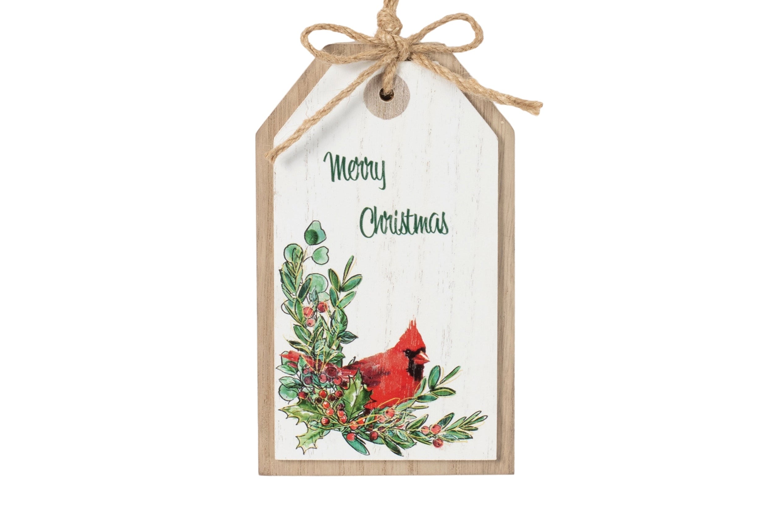 Add rustic charm to your holiday décor with this Merry Christmas Cardinal Tag Ornament Set. Each piece is crafted from durable MDF wood and finished with a natural jute hanger, measuring 3.5" L x 0.5" W x 6" H. The beautiful red cardinal artwork, framed by festive greenery and holly, makes these tags perfect for Christmas trees, wreaths, gift wrapping, garlands, or farmhouse-style seasonal displays. This set includes 12 decorative tags, ideal for creating coordinated holiday accents throughout your home.