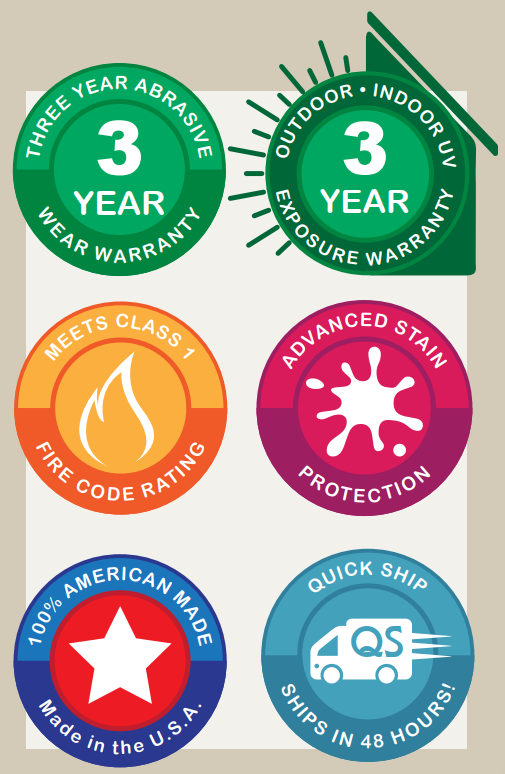 Mfg Warranty: 3-Year Limited Abrasive Wear Warranty, 3-Year UV Exposure Warranty, Advanced Stain Protection.
