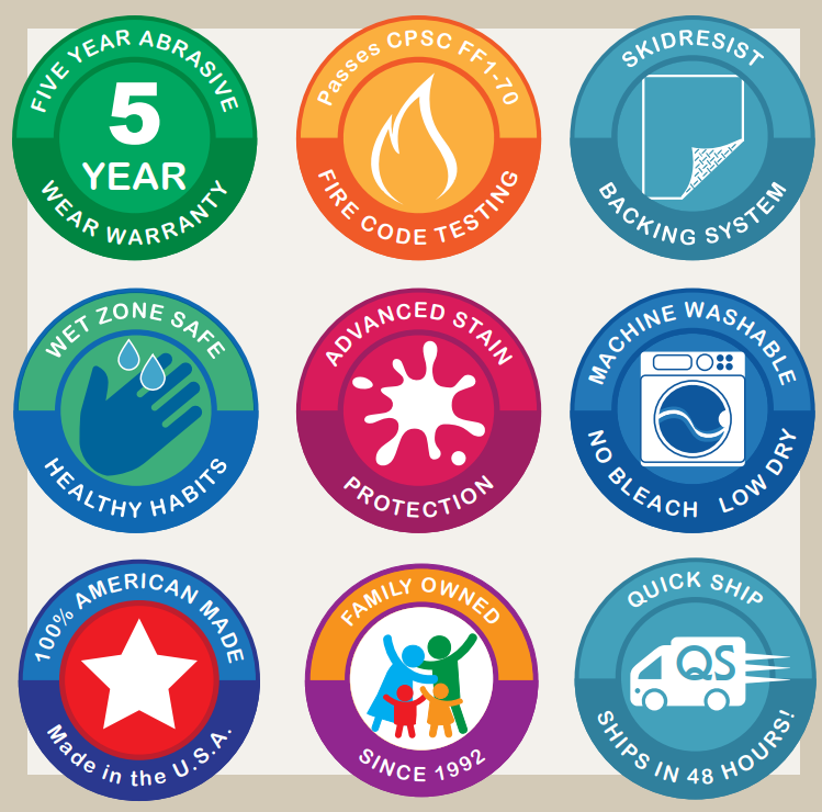 Mfg Warranty: 5-Year Limited Abrasive Wear Warranty – excludes backing & serge, Advanced Stain Protection, Soil Resistant, Machine Washable (Cold water with mild detergent. Gentle cycle. Line dry. Do Not Bleach.)