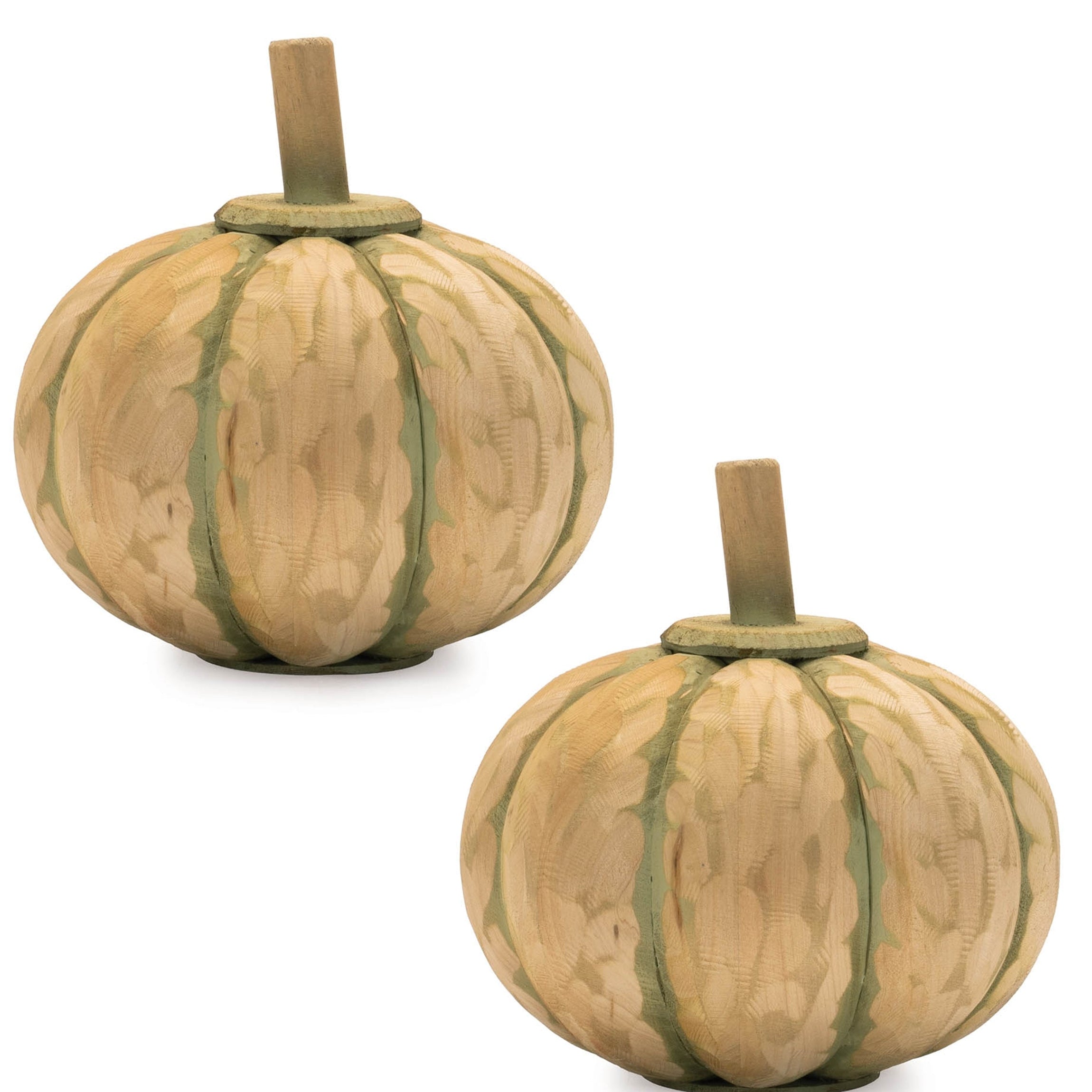 Carved Fir Wood Pumpkin Decor (Set of 2) – 7"H Beige & Green Rustic Fall Tabletop Accents by Melrose