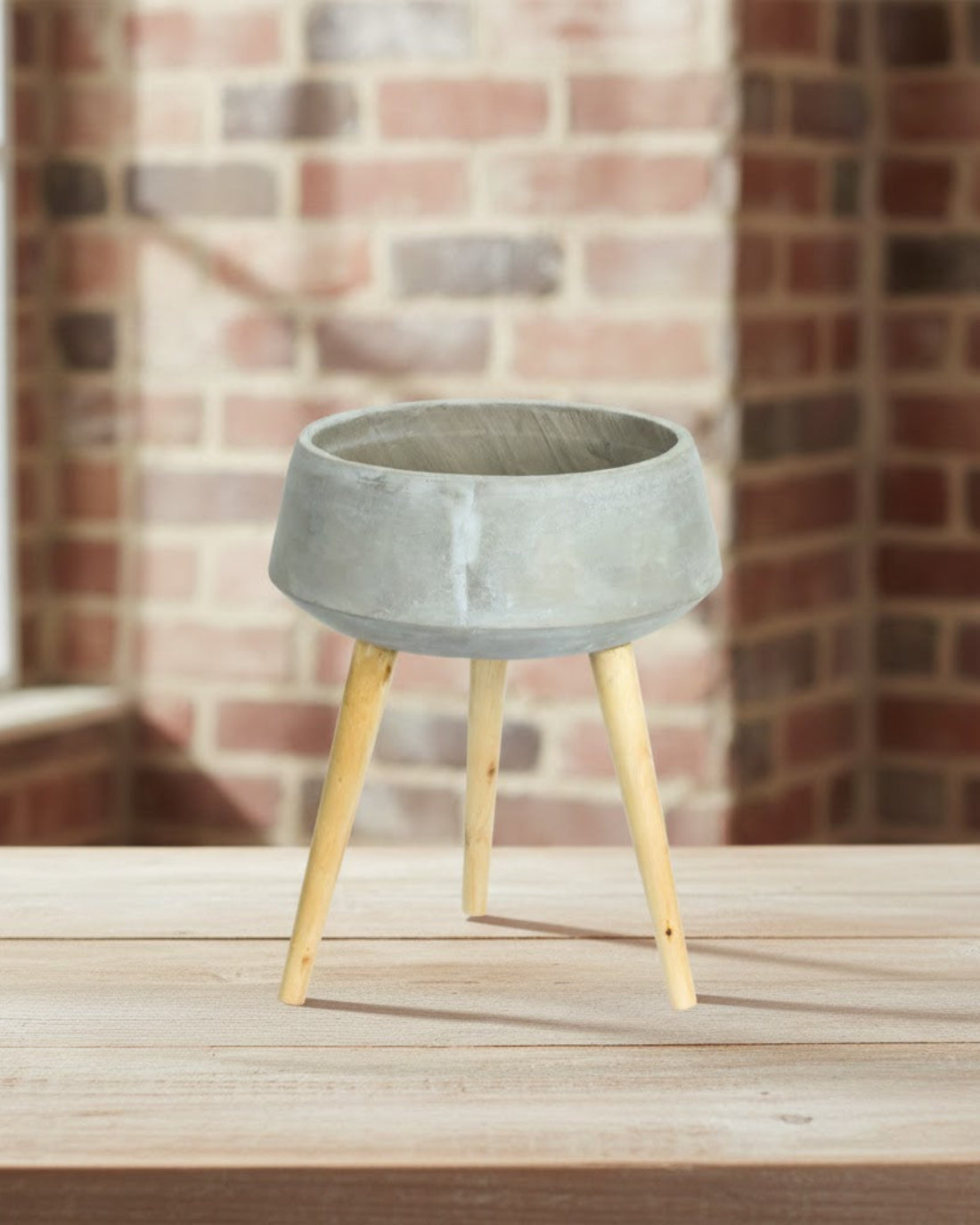 - Grey cement bowl with sturdy natural wood legs
