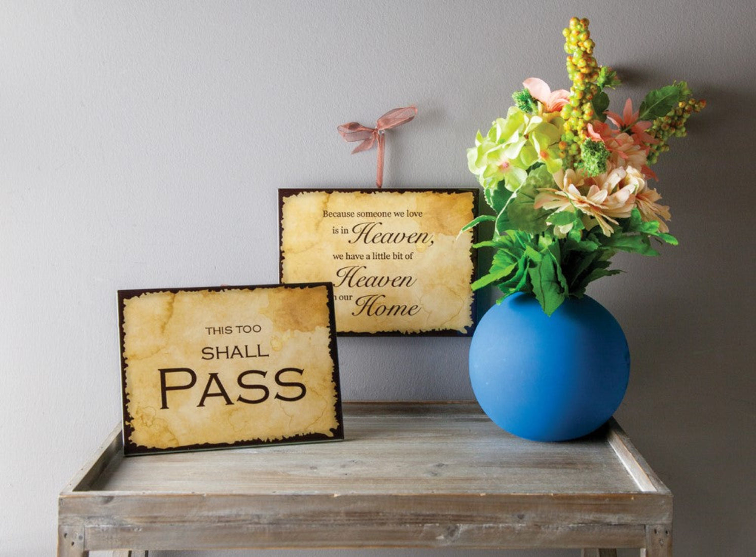 The Shall Pass Inspirational Plaque Set includes three beautifully crafted ceramic plaques designed to bring hope and encouragement to any space. Each plaque measures 6" × 8" and features uplifting artwork paired with a comforting message that serves as a reminder of strength and perseverance. The plaques are sized perfectly for display on walls, shelves, desks, or entryway areas, making them versatile home décor accents. Their smooth ceramic finish offers durability, while the inspirational message adds a thoughtful touch to living rooms, offices, or quiet spaces. Ideal for gifting or personal reflection, this set provides a meaningful visual reminder that difficult moments eventually pass.