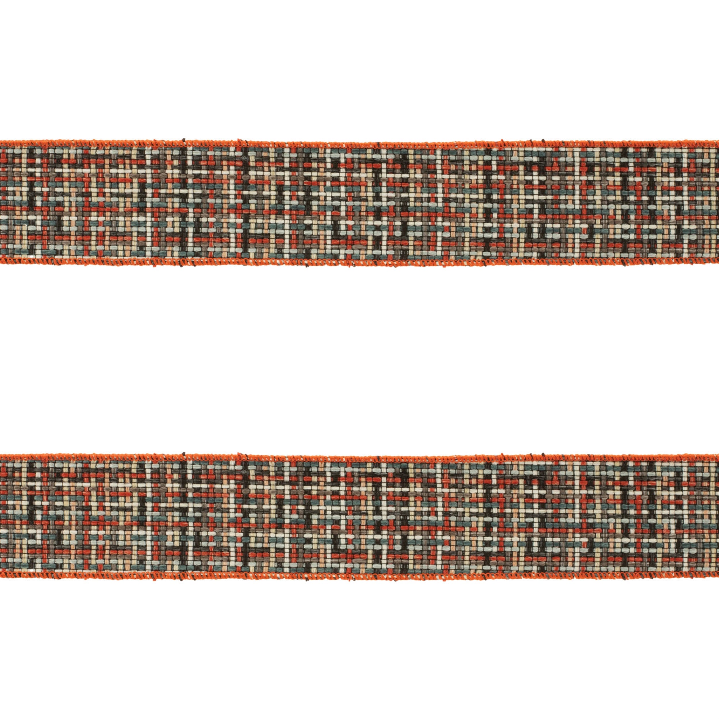 - Warm red, beige, blue, and black checkered pattern with red trim