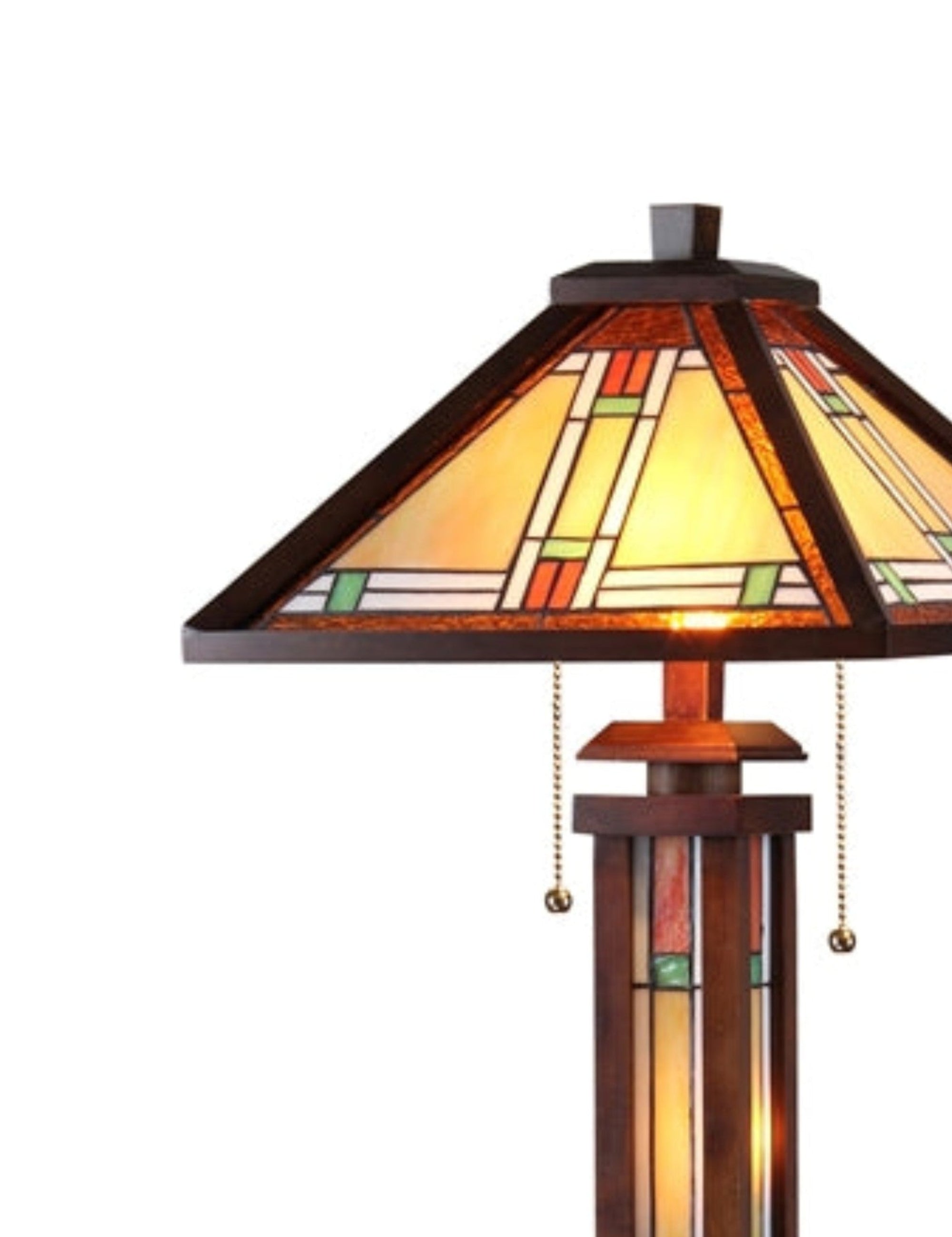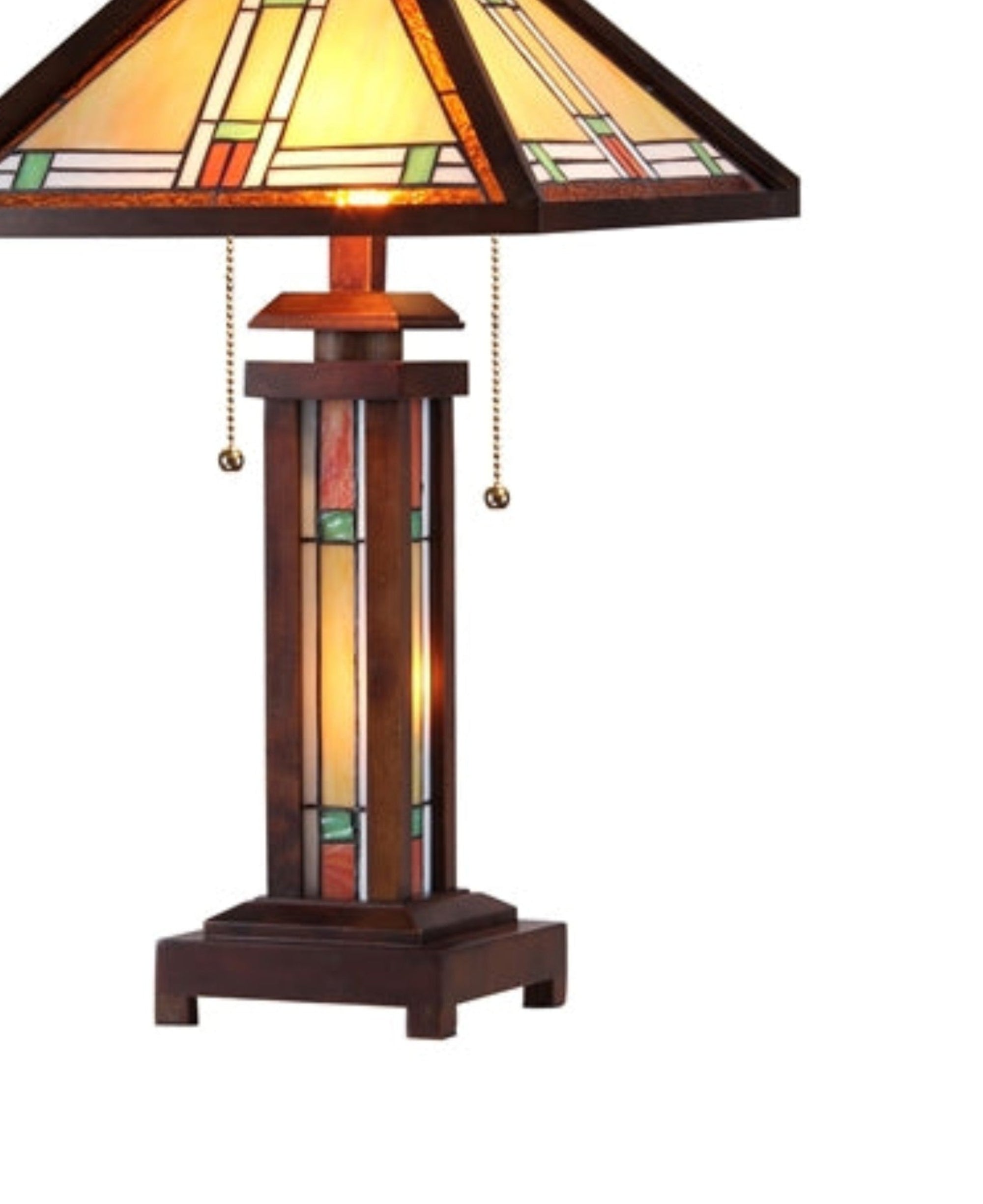 - Double lit design: stained glass shade & lighted wood-glass base