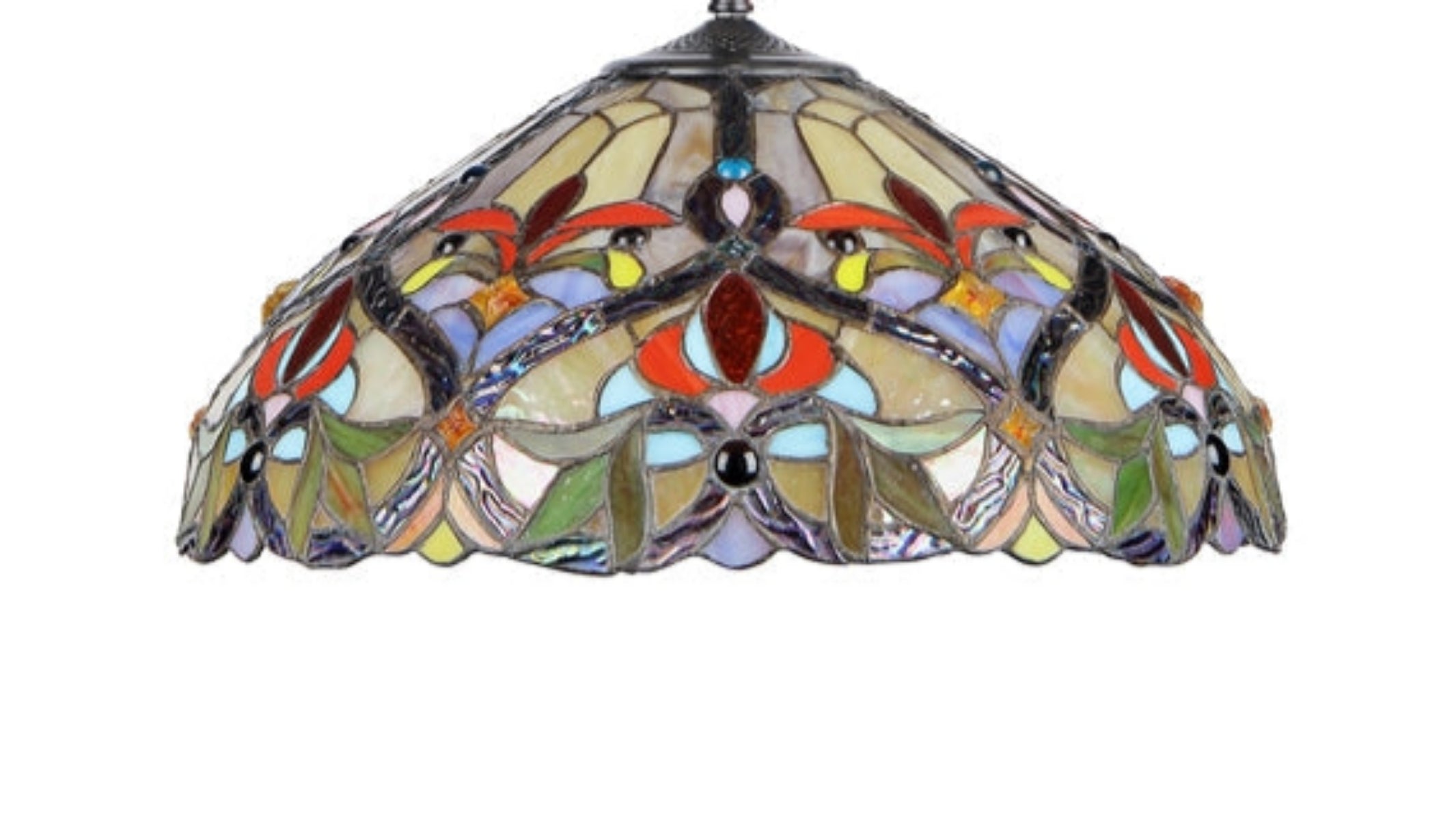- Handcrafted Tiffany-style stained glass shade with intricate Victorian patterns