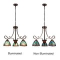 Liaison is a delightful, mini-chandelier in a traditional Victorian style, featuring detailed stained glass shades. This fixture would be perfect in a living room, dining room, and foyer. The shades are hand-crafted, using the same methods developed by Louis Comfort Tiffany in the early 1900s. This process entails using 152 hand-cut stained art glass pieces and 12 glass beads per shade, each wrapped in fine copper foil and soldered together at extremely high temperatures to form each unique piece. The exact size to the nearest inch may vary, and the exact color of each glass piece may vary due to each piece being hand-crafted. The first image is with the light shining through, and the second image is with no light. Dry-listed and recommended for an indoor setting.