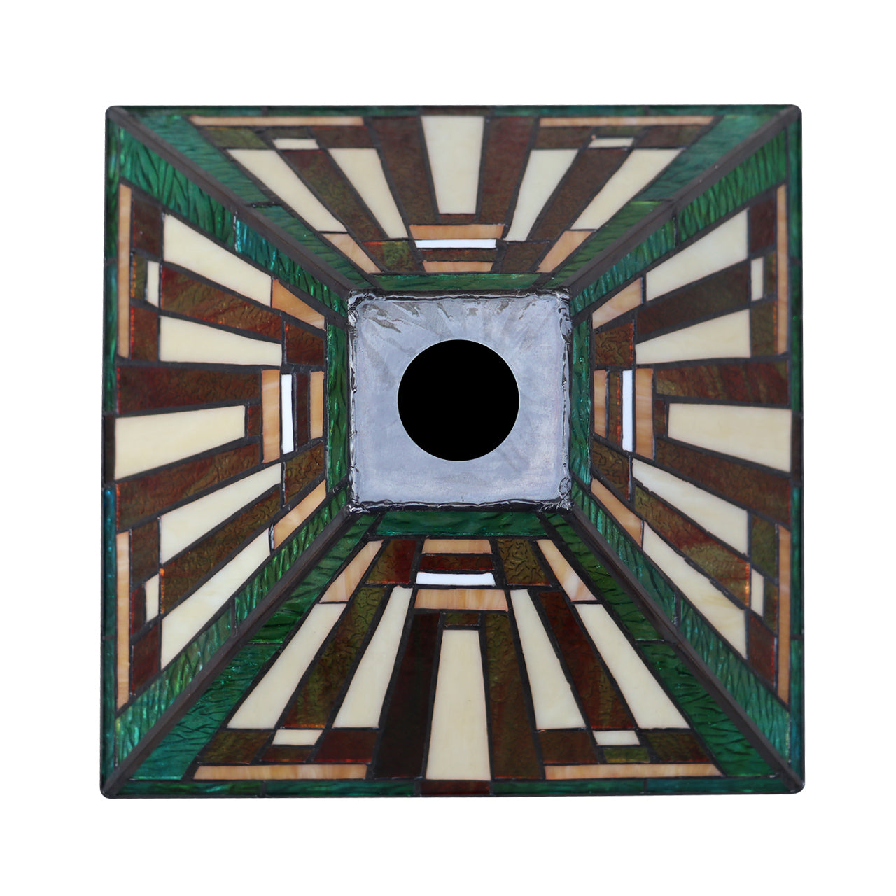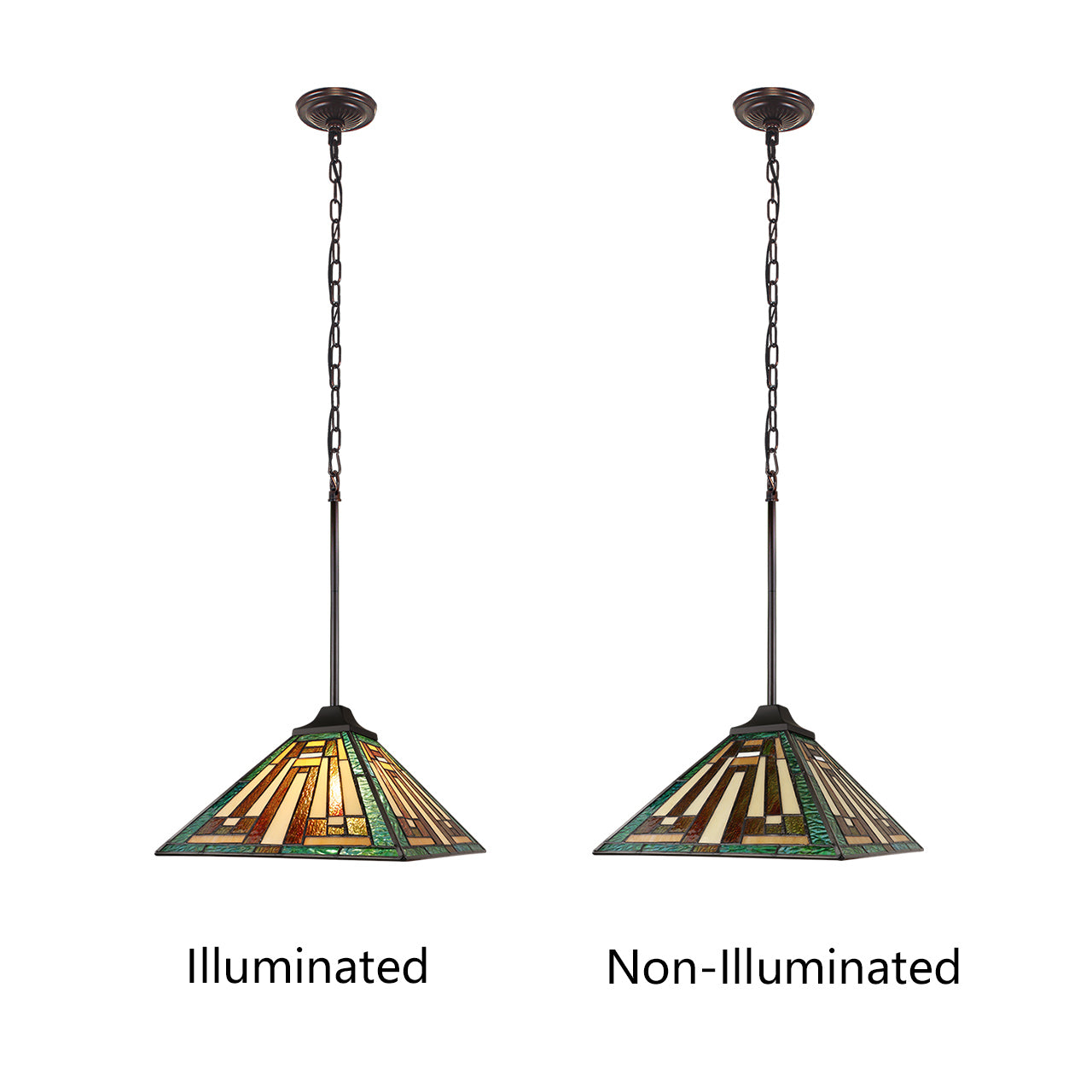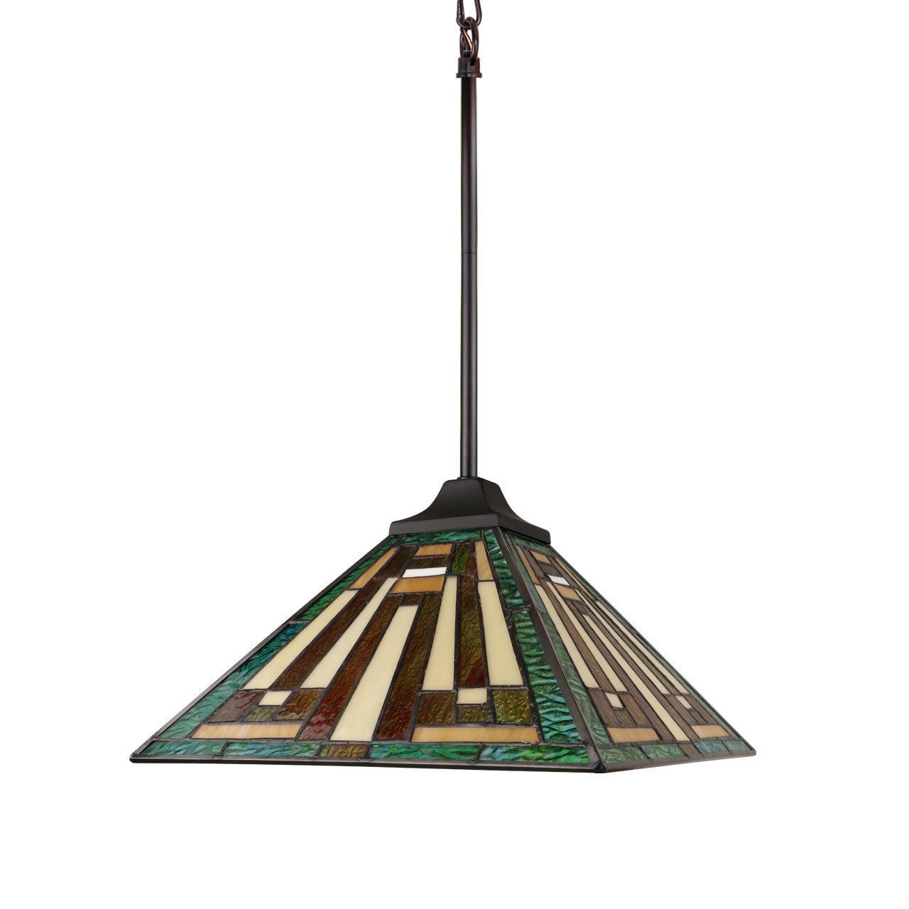 Firman is a stunning 1 light ceiling pendant, featuring a beautiful mission shade. This piece would be perfect in a hallway or even over a bed frame. Each shade is handcrafted, using the same methods developed by Louis Comfort Tiffany in the early 1900's. This process entails using 152 hand cut stained art glass pieces, each wrapped in fine copper foil and soldered together at extremely high temperatures to form each unique piece. Exact size to the nearest inch may vary, and exact color of each glass piece may vary due to each piece being handcrafted. First image is with the light shining through, second image is with no light. Dry listed and recommended for an indoor setting.