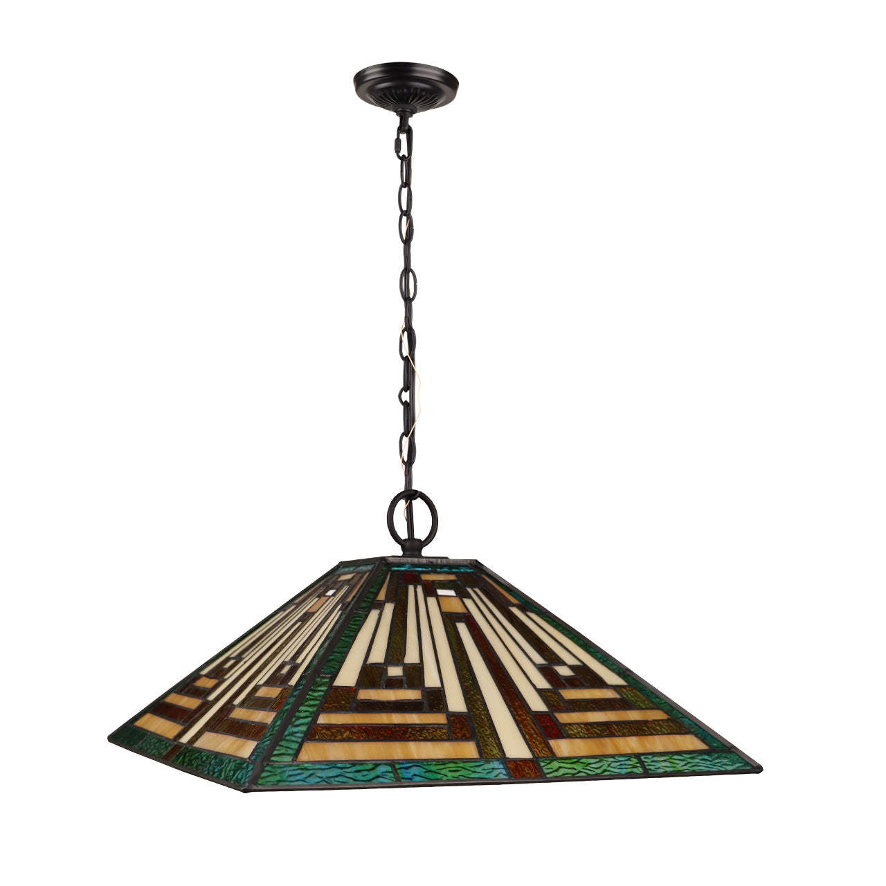 Firman is a stunning 2 light ceiling pendant, featuring a beautiful mission shade. This piece would be perfect in a hallway or even over a bed frame. Each shade is handcrafted, using the same methods developed by Louis Comfort Tiffany in the early 1900's. This process entails using 268 hand cut stained art glass pieces, each wrapped in fine copper foil and soldered together at extremely high temperatures to form each unique piece. Exact size to the nearest inch may vary, and exact color of each glass piece may vary due to each piece being handcrafted. First image is with the light shining through, second image is with no light. Dry listed and recommended for an indoor setting.