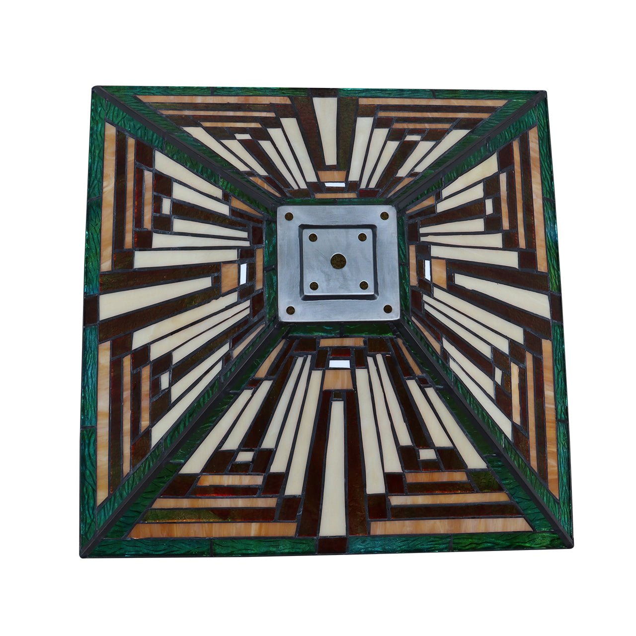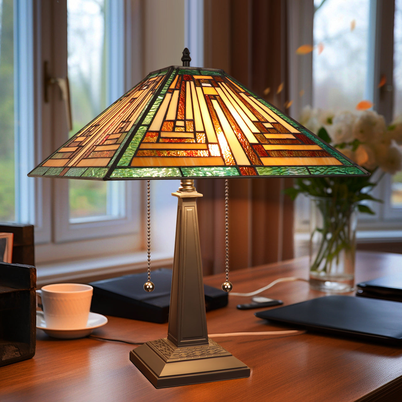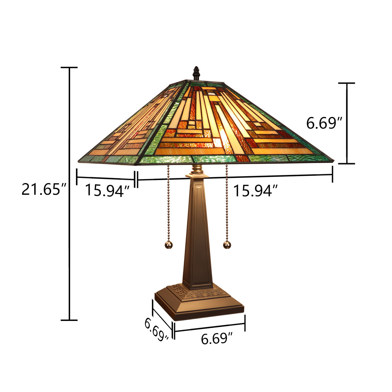 Firman is a stunning 2 light table lamp, featuring a beautiful mission shade. This piece would be perfect by a bed or in a foyer. Each shade is handcrafted, using the same methods developed by Louis Comfort Tiffany in the early 1900's. This process entails using 268 hand cut stained art glass pieces, each wrapped in fine copper foil and soldered together at extremely high temperatures to form each unique piece. Exact size to the nearest inch may vary, and exact color of each glass piece may vary due to each piece being handcrafted. First image is with the light shining through, second image is with no light. Dry listed and recommended for an indoor setting.