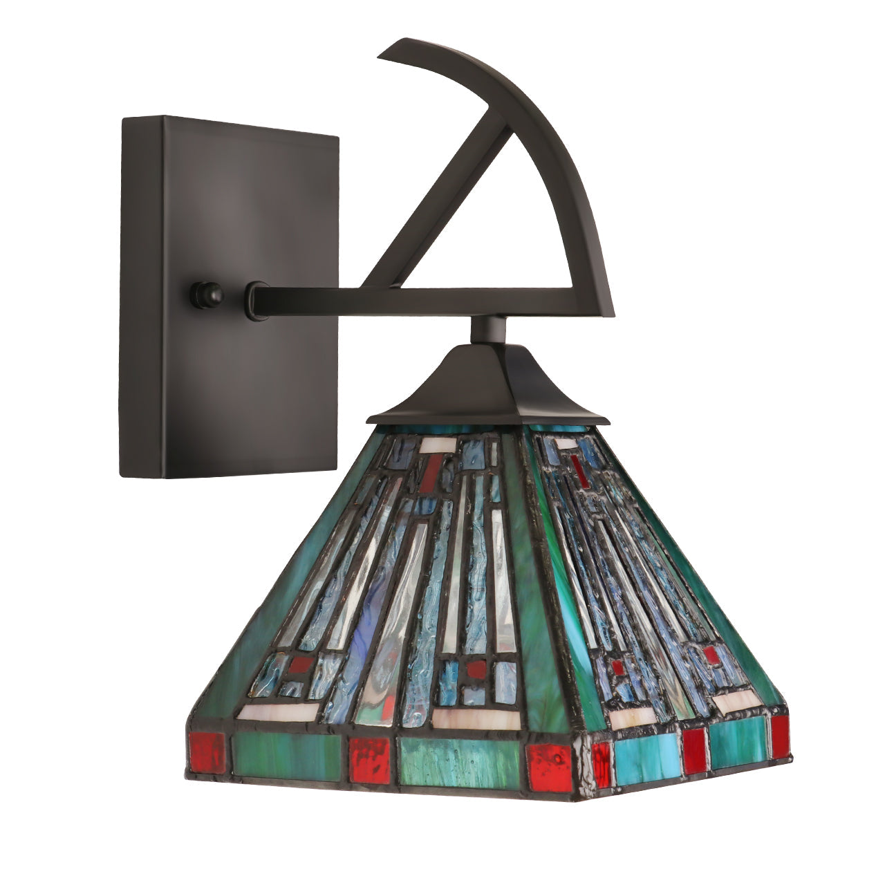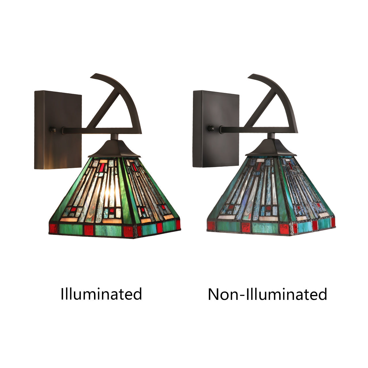 Innes is a stunning 1 light indoor wall sconce, featuring a beautiful mission shade. This piece would be perfect in a hallway or a foyer. Each shade is handcrafted, using the same methods developed by Louis Comfort Tiffany in the early 1900's. This process entails using 152 hand cut stained art glass pieces, each wrapped in fine copper foil and soldered together at extremely high temperatures to form each unique piece. Exact size to the nearest inch may vary, and exact color of each glass piece may vary due to each piece being handcrafted. First image is with the light shining through, second image is with no light. Dry listed and recommended for an indoor setting.