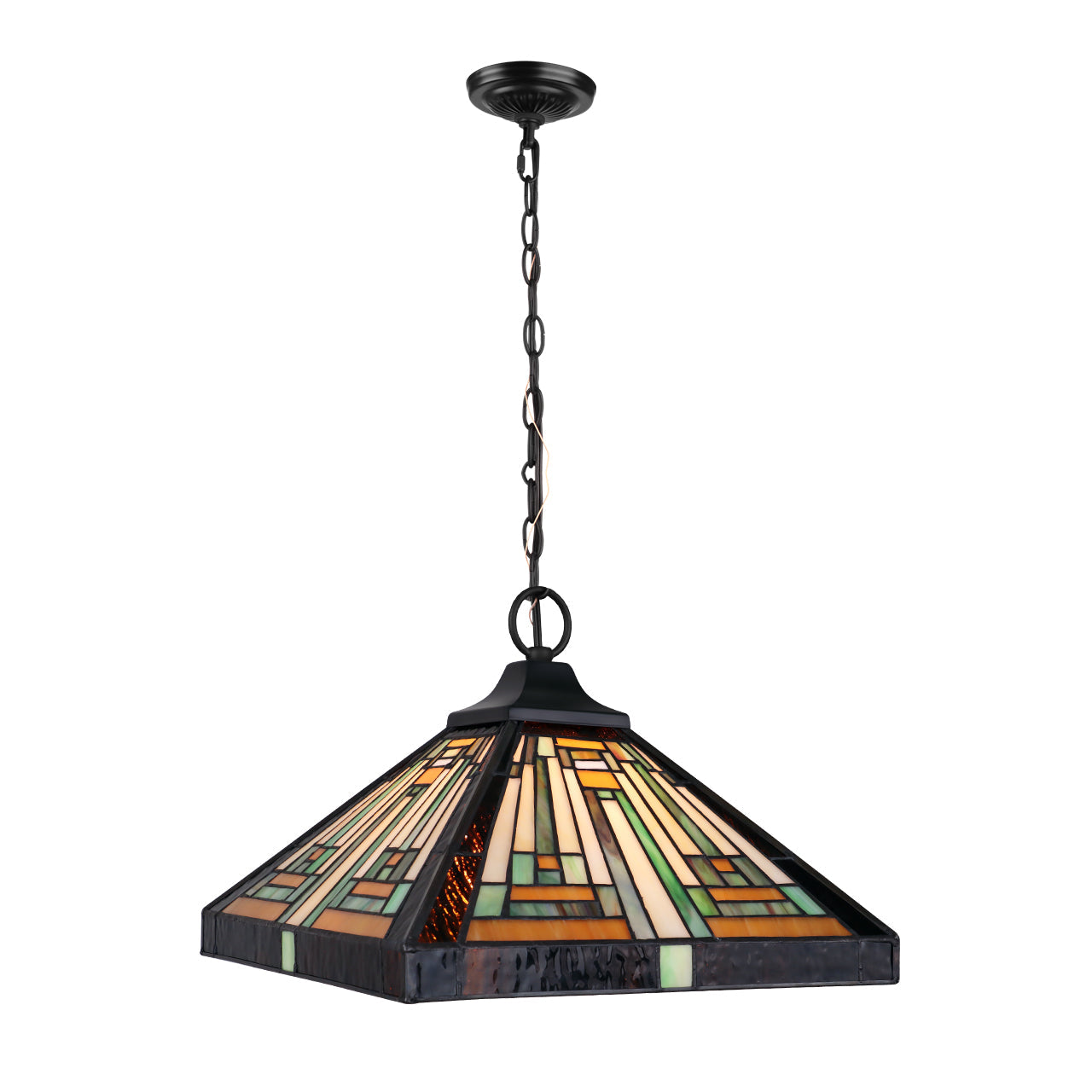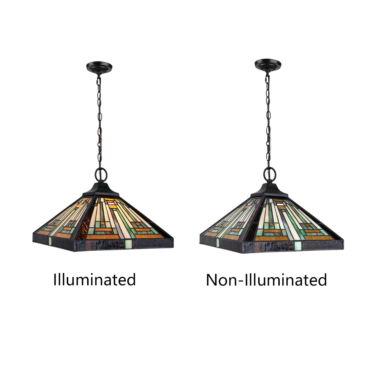 Innes is a stunning 1 light ceiling pendant, featuring a beautiful mission shade. This piece would be perfect in a hallway or even over a bed frame. Each shade is handcrafted, using the same methods developed by Louis Comfort Tiffany in the early 1900's. This process entails using 232 hand cut stained art glass pieces, each wrapped in fine copper foil and soldered together at extremely high temperatures to form each unique piece. Exact size to the nearest inch may vary, and exact color of each glass piece may vary due to each piece being handcrafted. First image is with the light shining through, second image is with no light. Dry listed and recommended for an indoor setting.