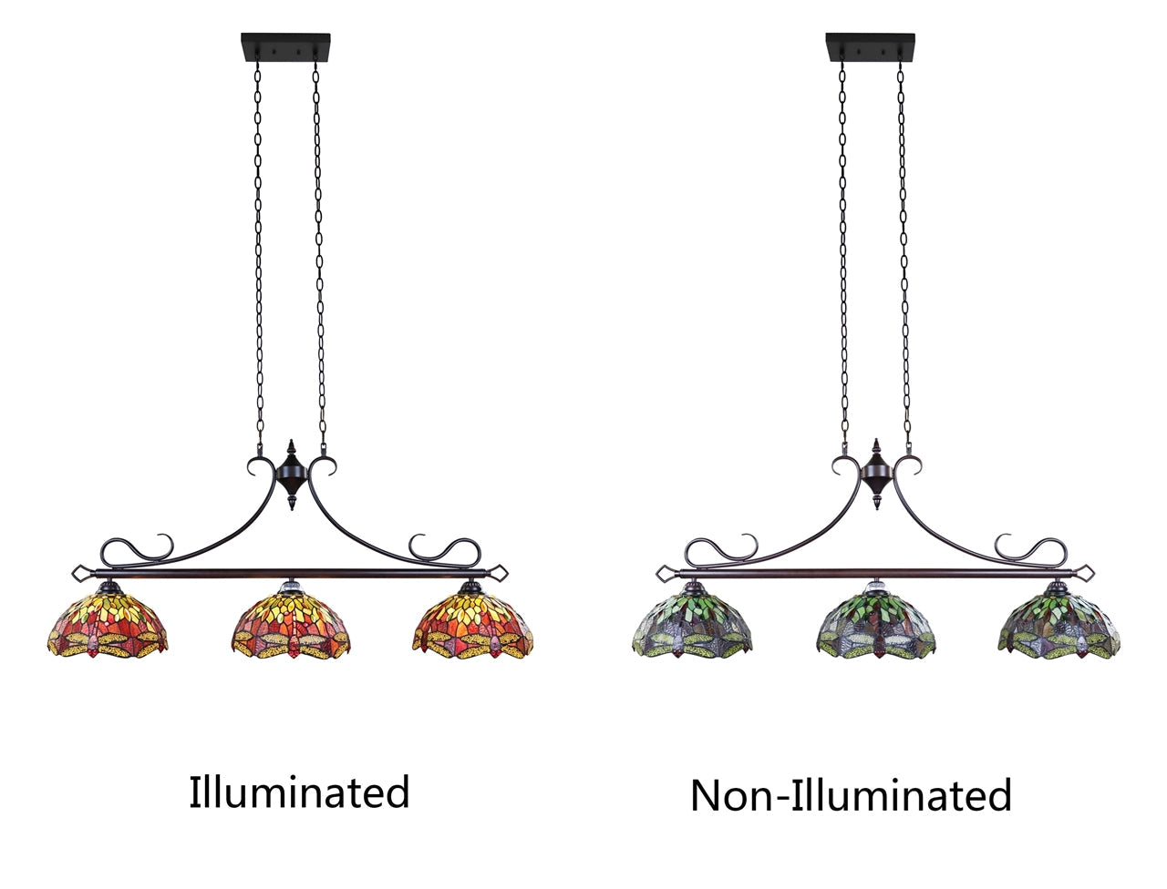 Empress is a beautiful island pendant, featuring 3 hand-made stained glass dragonfly shades and a dark bronze canopy. This chandelier would be perfect to hang over a dining room table or over an entranceway. The handcrafted shades are made using the same methods developed by Louis Comfort Tiffany in the early 1900s. This process entails using 97 hand-cut stained art glass pieces and 31 glass beads, each wrapped in fine copper foil and soldered together at extremely high temperatures to form each unique piece. The exact size to the nearest inch may vary, and the exact color of each glass piece may vary due to each piece being handcrafted. The first image is with the light shining through, the second image is with no light. Dry listed and recommended for an indoor setting.