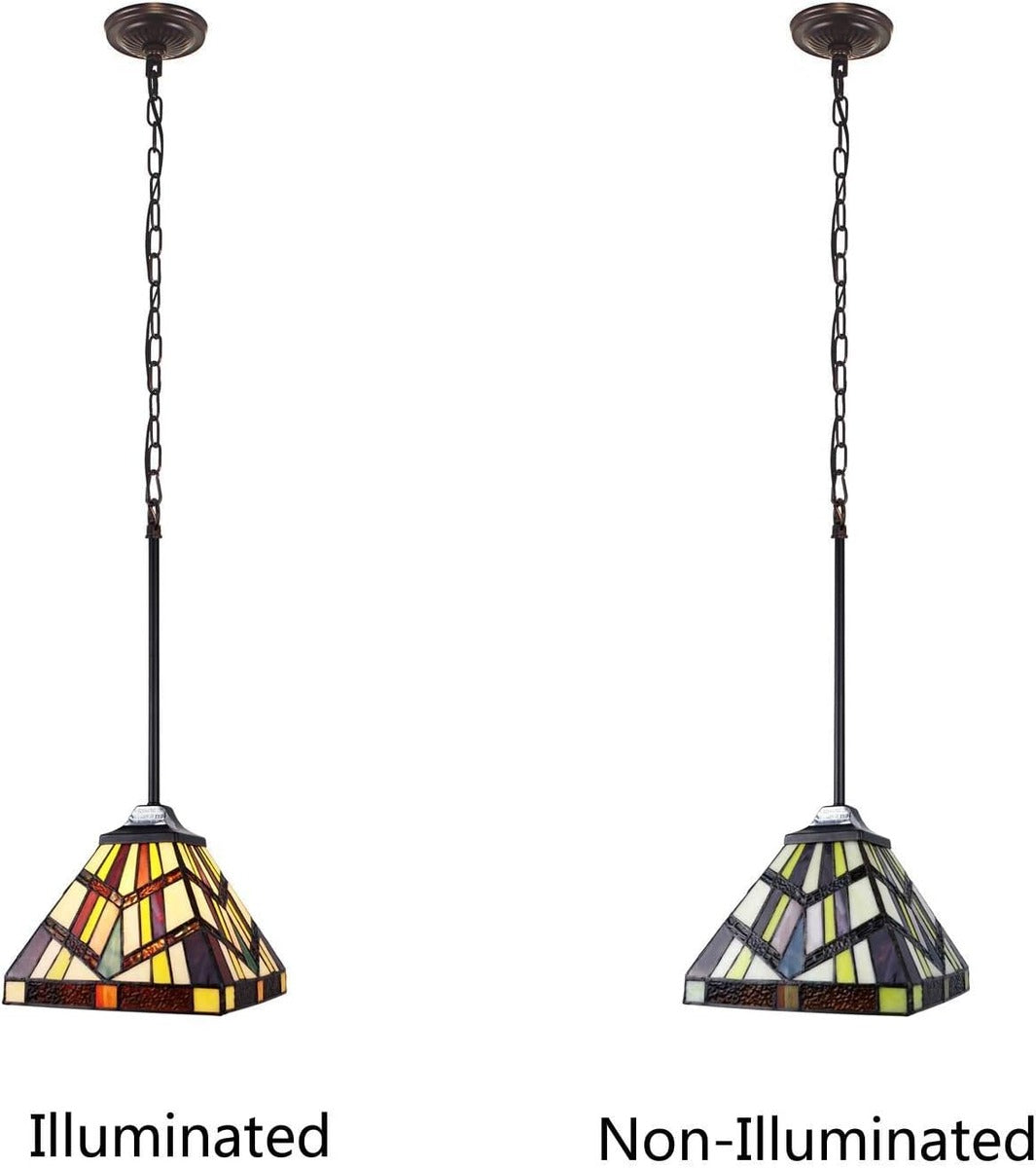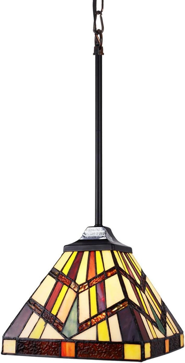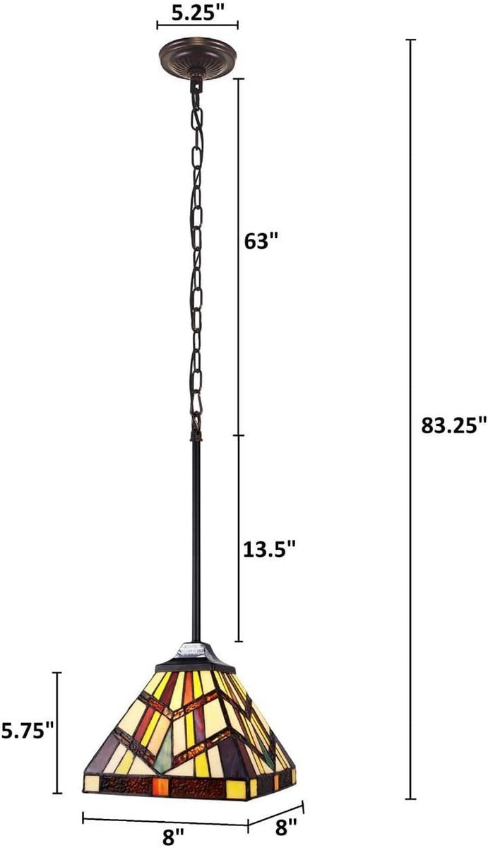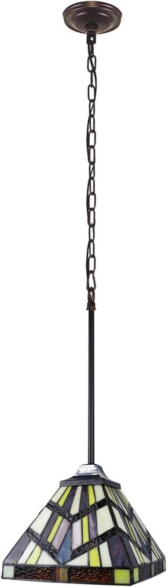 Vincent is a stunning 1 light mini pendant, featuring a beautiful mission shade. This piece would be perfect in a hallway or even over a bed frame. Each shade is hand crafted, using the same methods developed by Louis Comfort Tiffany in the early 1900`s. This process entails using 164 hand cut stained art glass pieces, each wrapped in fine copper foil and soldered together at extremely high temperatures to form each unique piece. Exact size to the nearest inch may vary, and exact color of each glass piece may vary due to each piece being hand crafted. First image is with the light shining through, second image is with no light. Dry listed and recommended for an indoor setting.