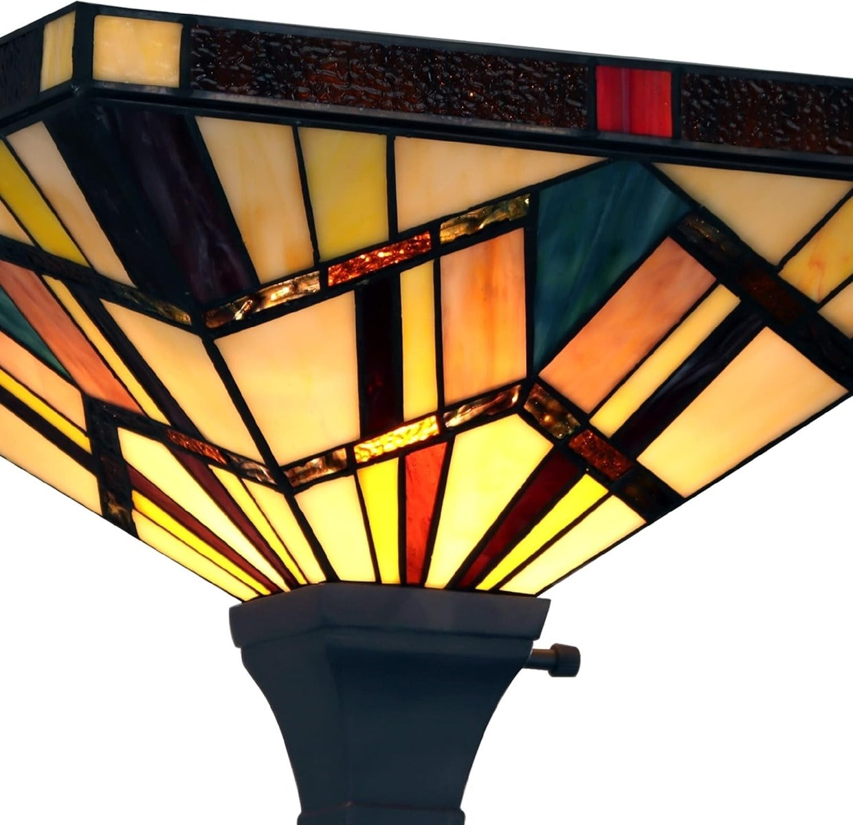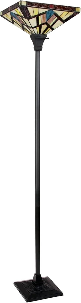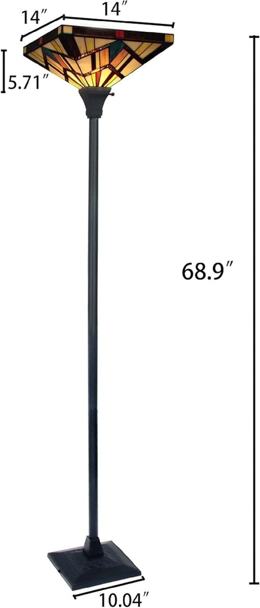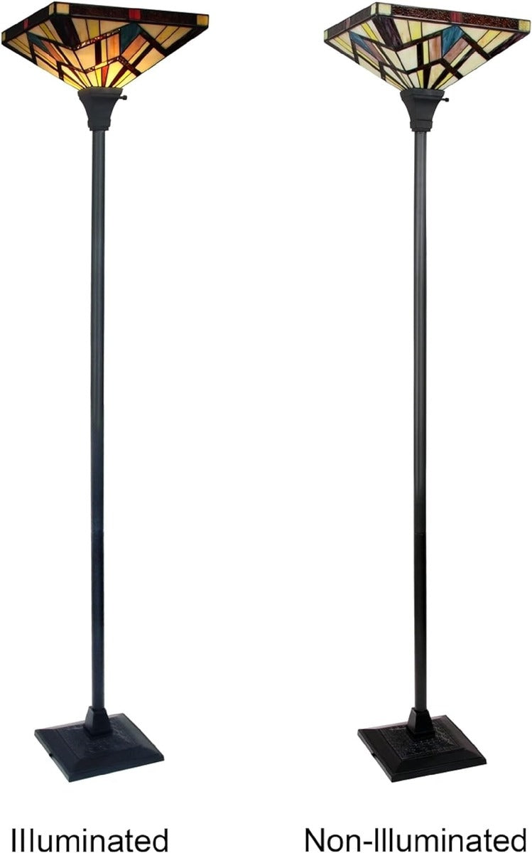 VINCENT, a Tiffany-style Mission design 1-light torchiere floor lamp features a blackish bronze finish that will complement many decors throughout your home. Hand crafted from individually hand cut pieces of art glass that will add color and beauty to any space. Main colors are beige and green. Handcrafted using the same techniques that were developed by Louis Comfort Tiffany in the early 1900s, this beautiful Tiffany-style piece contains 164 hand-cut pieces of stained glass, each wrapped in fine copper foil. This fixture is compatible with flourescent, incandescent, and LED bulbs. UL Listed, Dry listed and recommended for an indoor setting only.