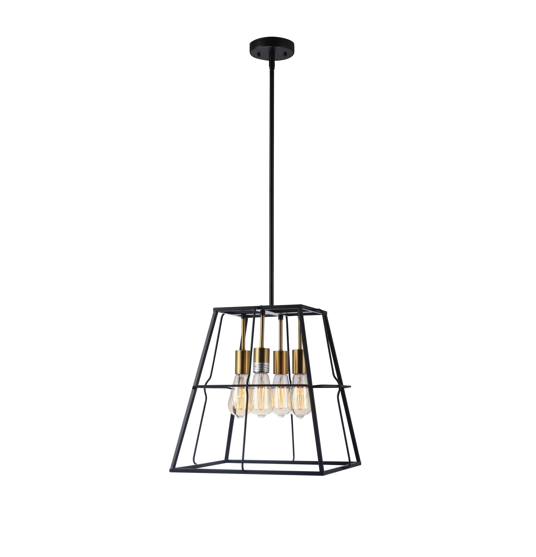 Ironclad is a sleek trapezoid design 4 light, industrial-style ceiling pendant that would be a perfect fit over a bar area, over a dining table and in the hallway! The metal frame is in a matt black and gold finish. The fixture takes four 60W E26 bulbs and is compatible with incandescent, flourescent, and LED bulbs. This fixture is dry listed and UL listed, and not recommended for damp/wet locations. Recommended for residential and commercial use.