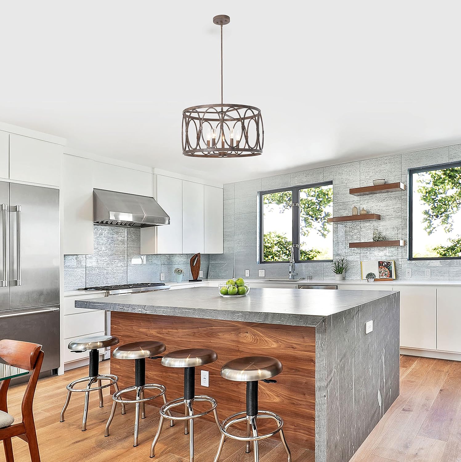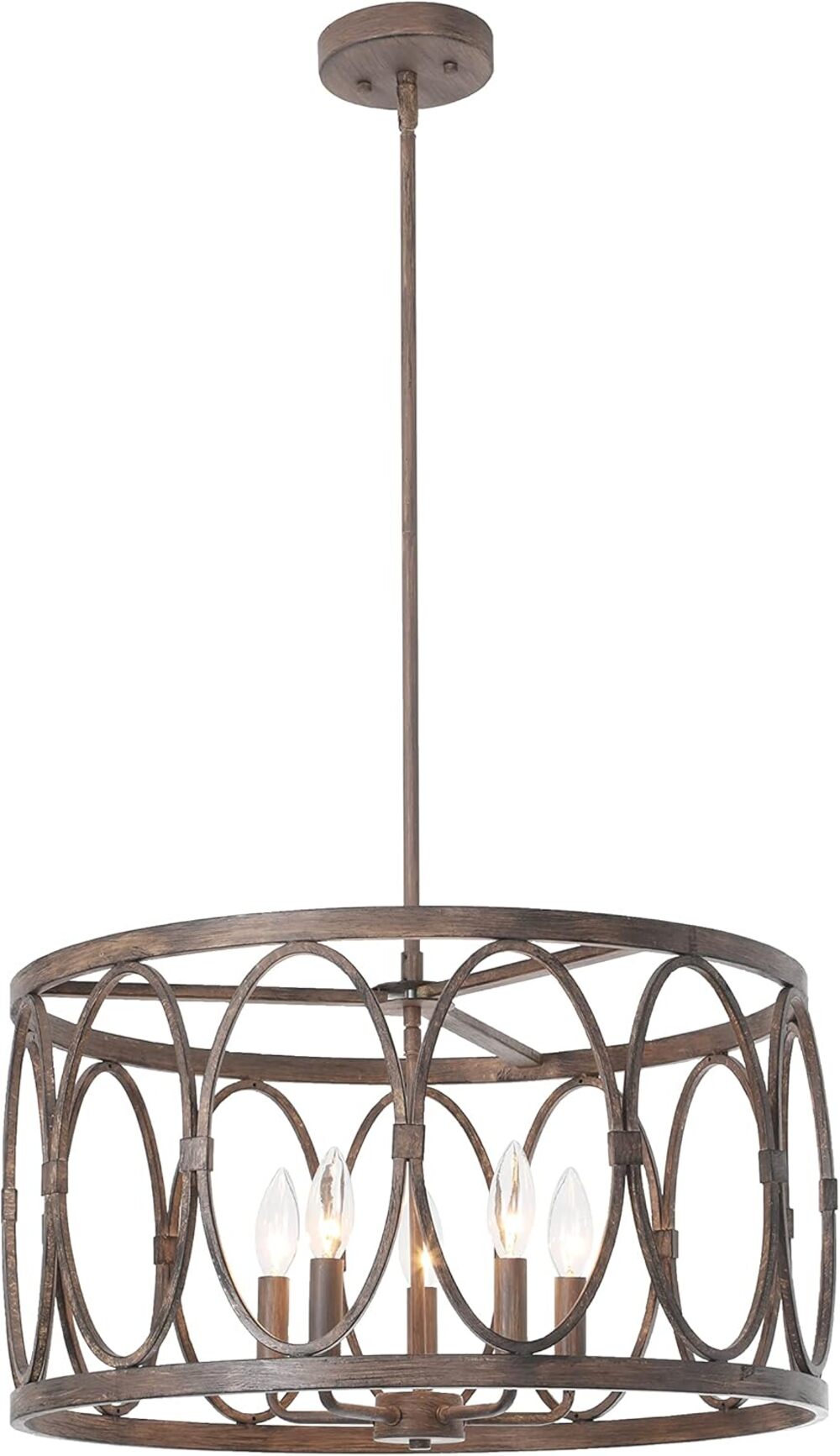 Navy is a gorgeous, antique wood finish, farmhouse-style 6 light hanging pendant, and it would be perfect focal point in any room! It takes five 60W E26 bulbs (not included), is compatible with fluorescent, incandescent, and LED bulbs, and would a perfect fit in the living room, dining room, hallway, den and foyer! This fixture is dry listed and UL listed, and not recommended for damp/wet locations. Recommended for residential and commercial use.