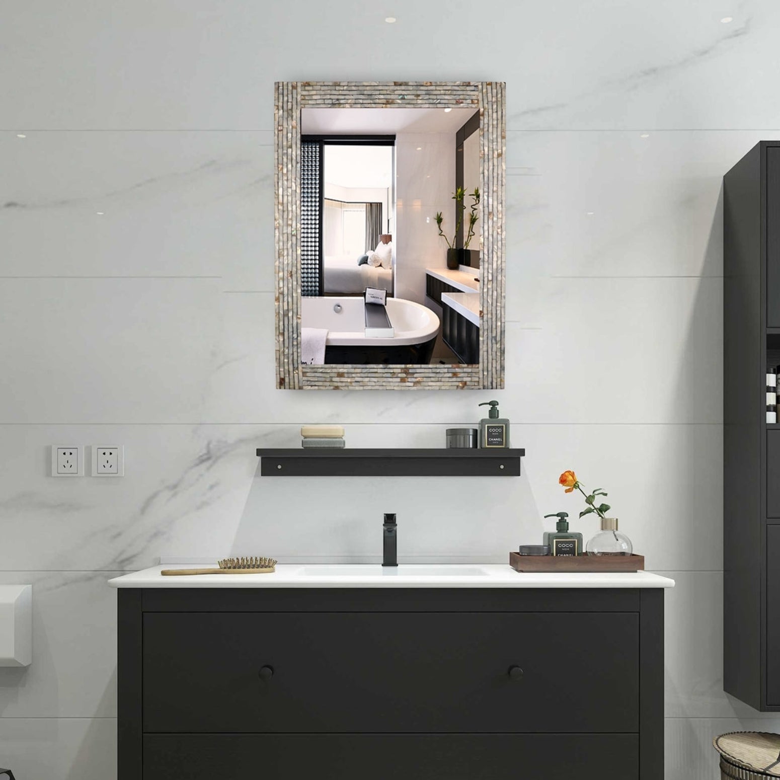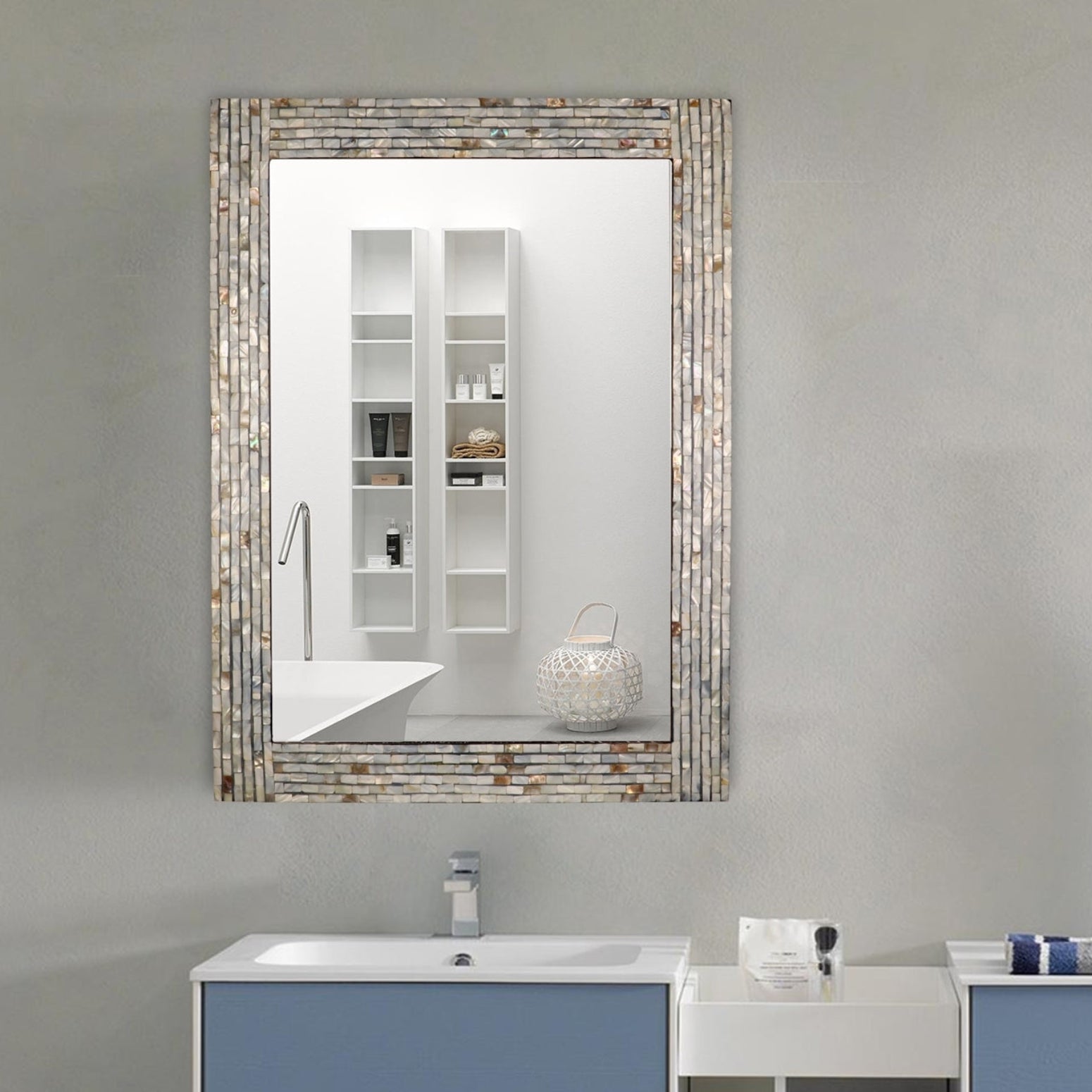 Looking for a unique addition for your home? Look no further! This mosaic, rectangle-shaped, seashell finish, framed wall mirror would look great above the couch, in the bedroom, or as an accent piece between two windows! This mirror hangs vertically. The mirror is damp listed for use in a restroom, but is not recommended for use outdoors.