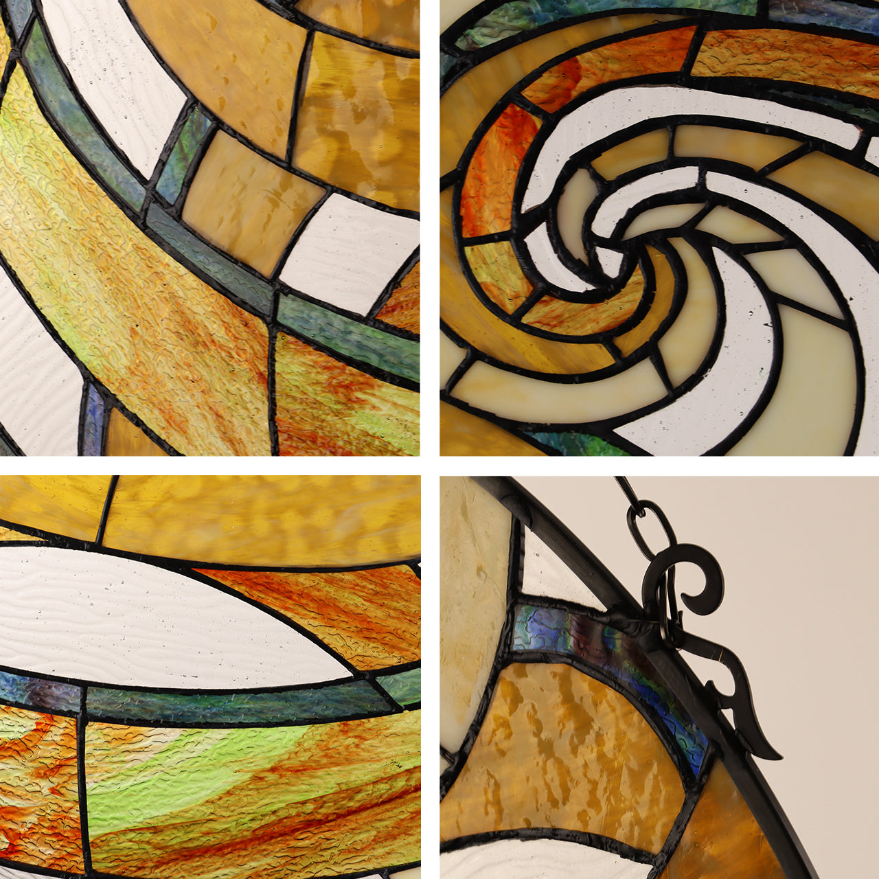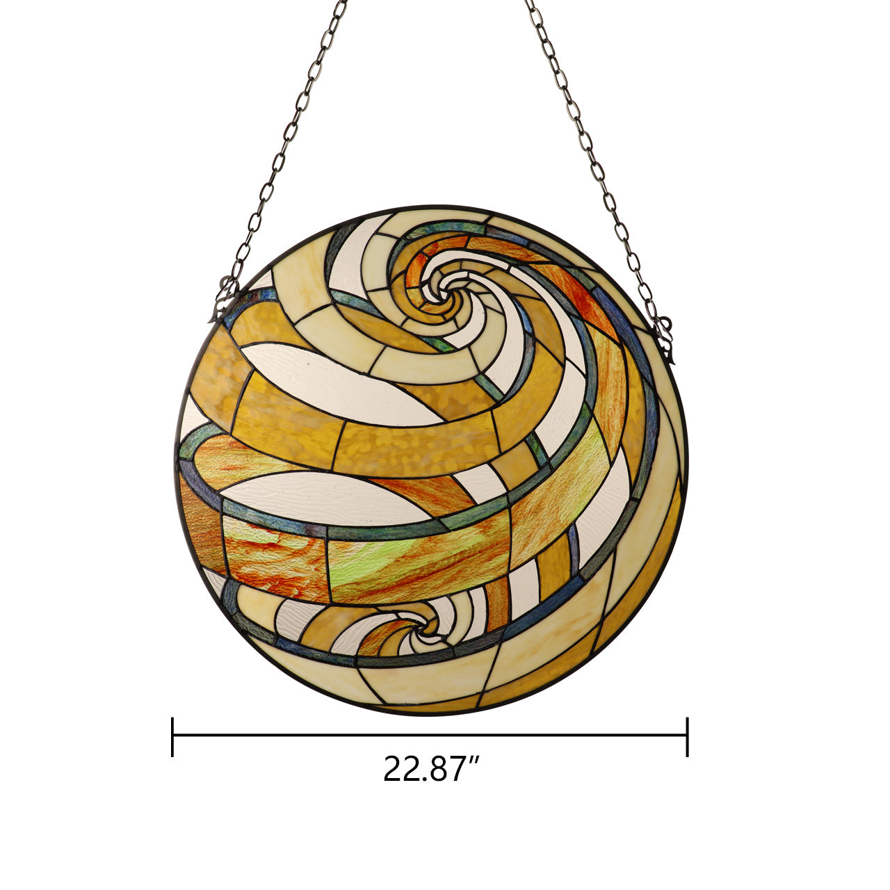Terra, a gorgeous geometric style tiffany-glass window panel, is an excellent addition for any home. Terra, named for the orange swirls that resemble planet earth's deserts, will bring a sense of peace and calm whenever the sun shines through! The handcrafted Tiffany panel is made up of 119 pieces of hand cut, stained art glass, expertly pieced and soldered together, to create each panel. Each of CHLOE's Tiffany-style stained glass panels are formed using the very same technique developed by Louis Comfort Tiffany in the early 1900's, using hand cut stained art glass, each wrapped in fine copper foil and soldered together at extremely high temperatures to form each unique panel. Exact size to the nearest inch may vary, and exact color of each glass piece may vary due to each piece being handcrafted. First image is with the light shining through, second image is with no light. Dry listed and recommended for an indoor setting.