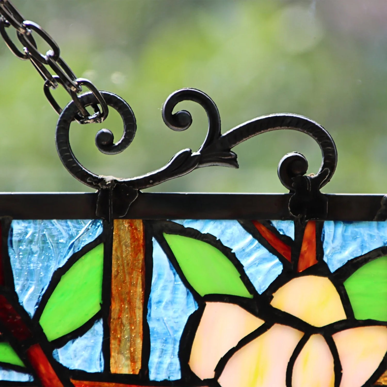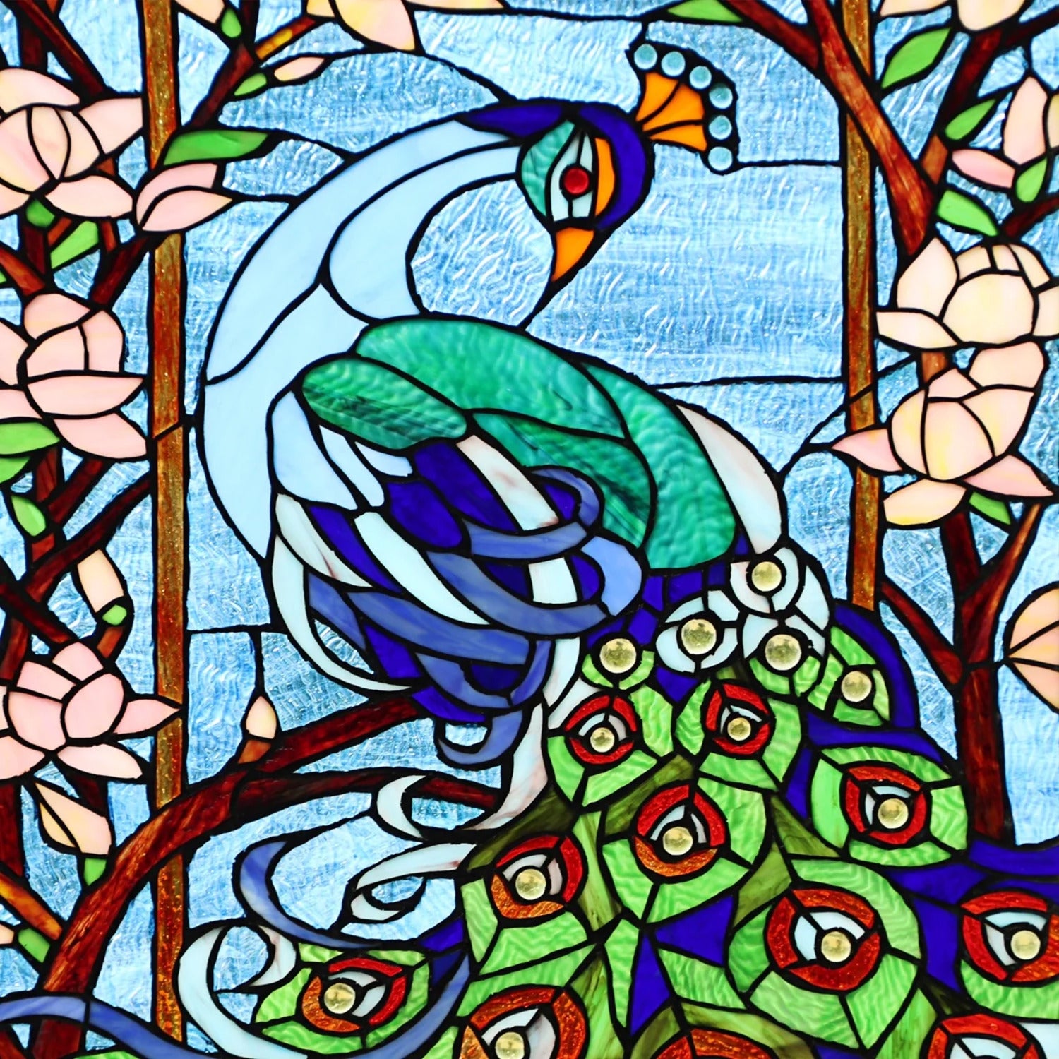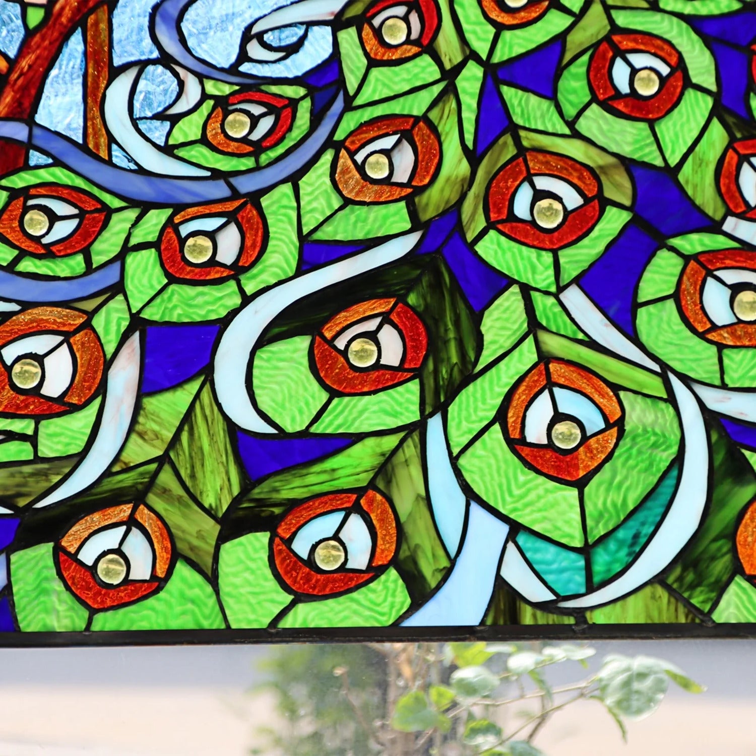 Looking for something to spice up your view in the kitchen, dining room and living room? Look no further, this stunning, Peacock-design window panel is sure to brighten up the room with it`s vibrant blue, green and pink colors. The hand crafted Tiffany panel is made up of over 600 pieces of hand cut stained art glass and 62 glass beads, expertly pieced and soldered together to create each panel. Each of CHLOE`s Tiffany-style stained glass panels are formed using the very same techninique developed by Louis Comfort Tiffany in the early 1900`s, using hand cut stained art glass, each wrapped in fine copper foil and soldered together at extremely high temperatures to form each unique panels. Exact size to the nearest inch may vary, and exact color of each glass piece may vary due to each piece being hand crafted. First image is with the light shining through, second image is with no light. Dry listed and recommended for an indoor setting.