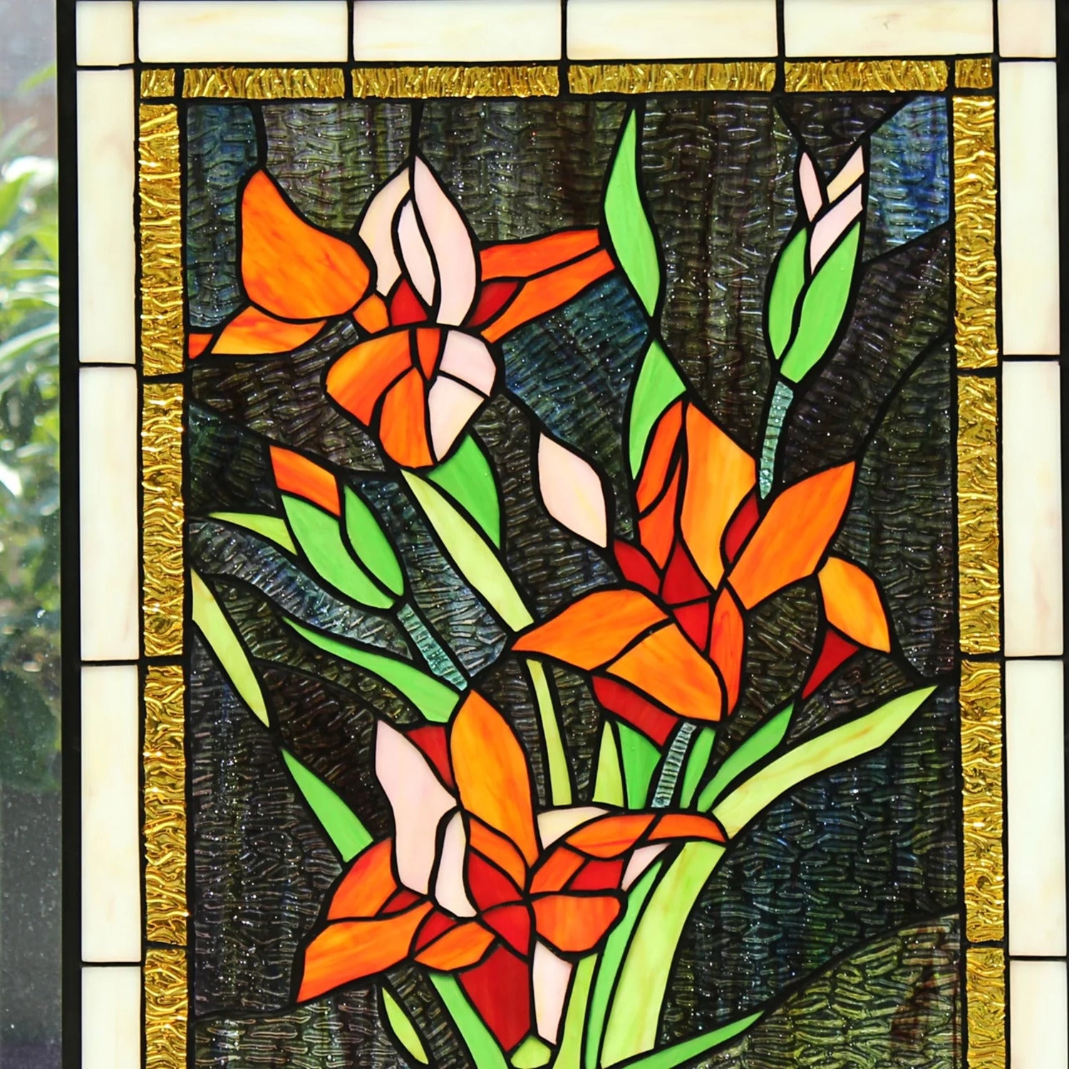 Orange Lily, named for the featured flowers in this Chloe panel, is a gorgeous stained glass window panel, showcasing vibrant, orange lilies. This panel would be perfect in any window in your home! The hand crafted Tiffany panel is made up of 151 pieces of hand cut, stained art glass, expertly pieced and soldered together to create each panel. Each of CHLOE`s Tiffany-style stained glass panels are formed using the very same techninique developed by Louis Comfort Tiffany in the early 1900`s, using hand cut stained art glass, each wrapped in fine copper foil and soldered together at extremely high temperatures to form each unique panels. Exact size to the nearest inch may vary, and exact color of each glass piece may vary due to each piece being hand crafted. First image is with the light shining through, second image is with no light. Dry listed and recommended for an indoor setting.