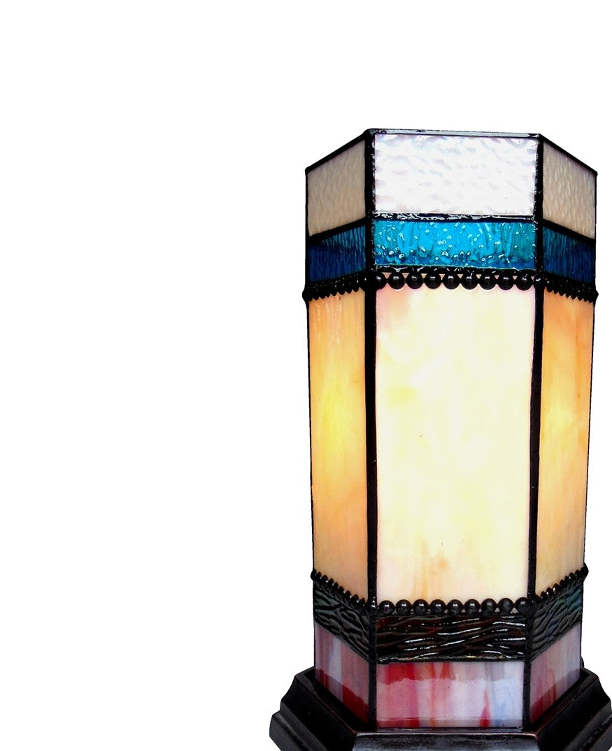 Elevate any space with the vintage-inspired charm of the Chester Tiffany-style accent pedestal table lamp. Standing 14 inches tall, this handcrafted stained glass lamp features a sleek hexagonal shade showcasing a geometric motif in warm tones. Its hand-cut Tiffany-glass pieces are skillfully arranged for a visually striking finish that radiates artisan elegance.