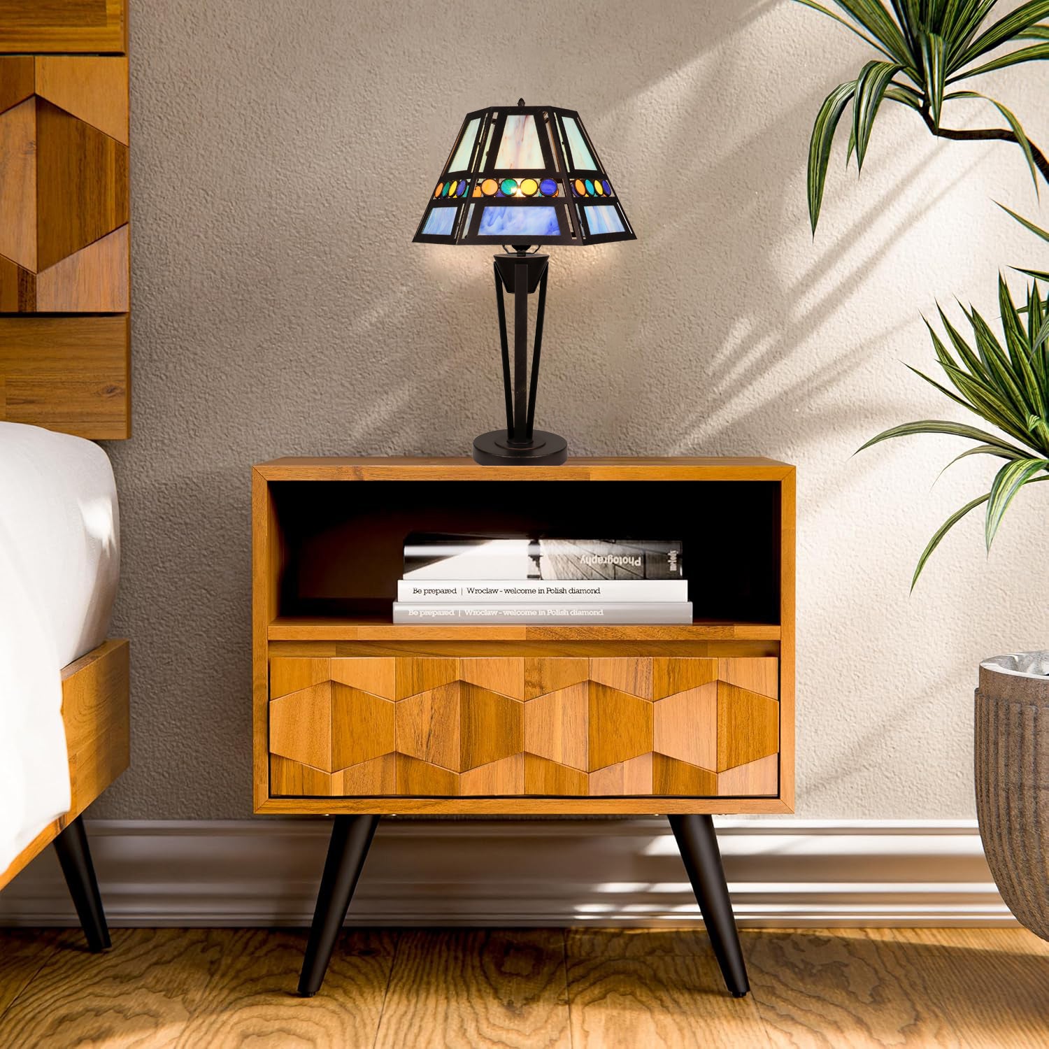 New to the Chloe spotlight is the beautiful Retro-Style line! These lamps are made up of stained glass pieces that are carefully inserted into metal frames, no soldering! This lamp is made up of 36 pieces of hand-cut art glass and features a unique base design, sure to complement your modern home decor. The exact color of each glass piece may vary due to each piece being handcrafted. First image is with the light shining through, second image is with no light. Dry listed and recommended for an indoor setting.