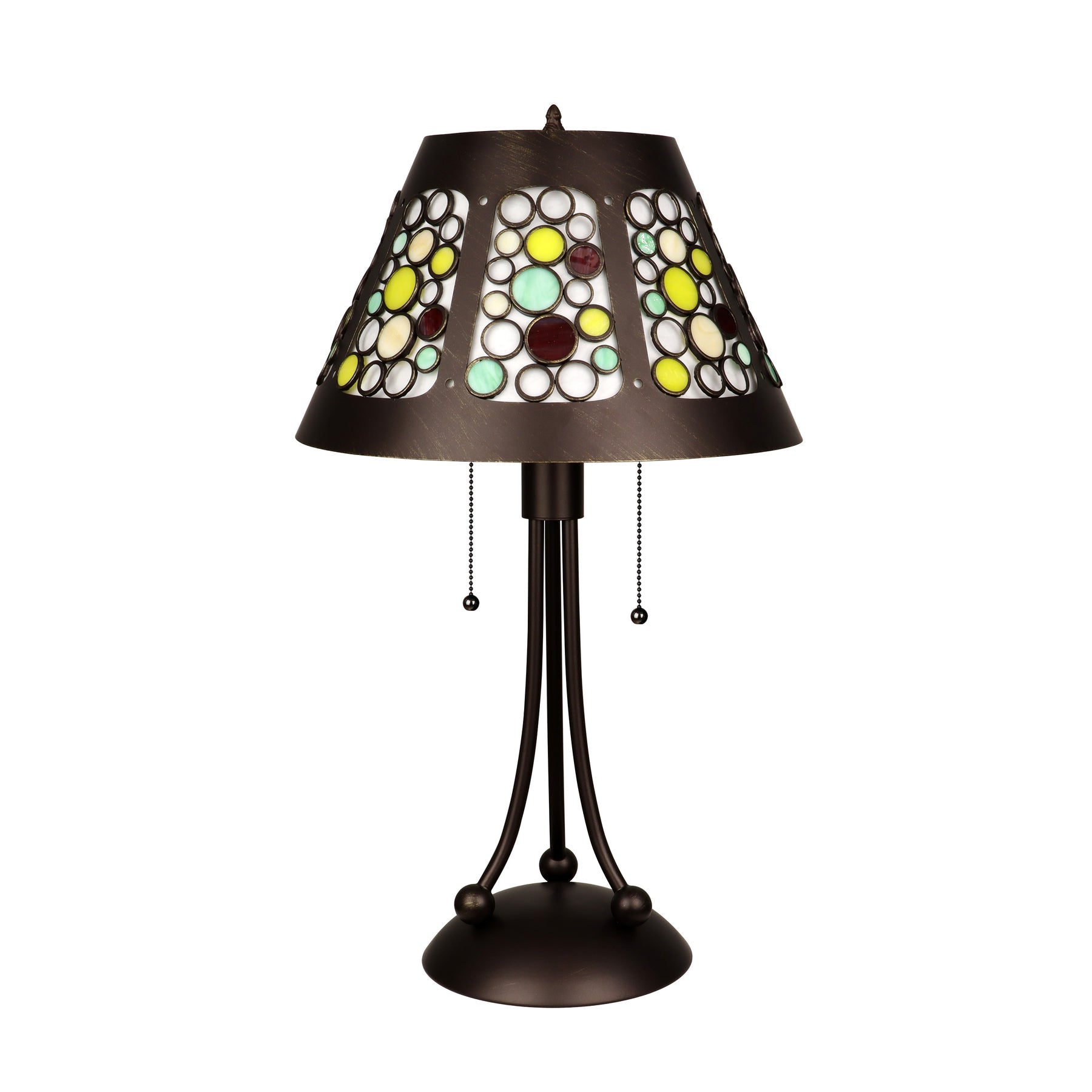 New to the Chloe spotlight is the beautiful Retro-Style line! These lamps are made up of stained glass pieces that are carefully inserted into metal frames, no soldering! This lamp is made up of 72 pieces of hand-cut art glass and features a unique base design, sure to complement your modern home decor. The exact color of each glass piece may vary due to each piece being handcrafted. First image is with the light shining through, second image is with no light. Dry listed and recommended for an indoor setting.
