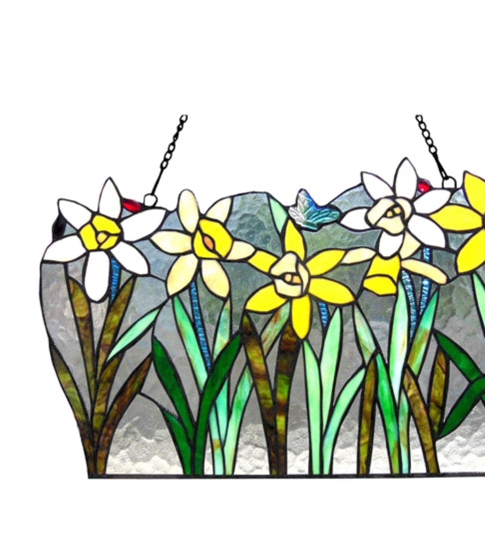 Handcrafted stained glass window panel featuring intricate daisy blooms
