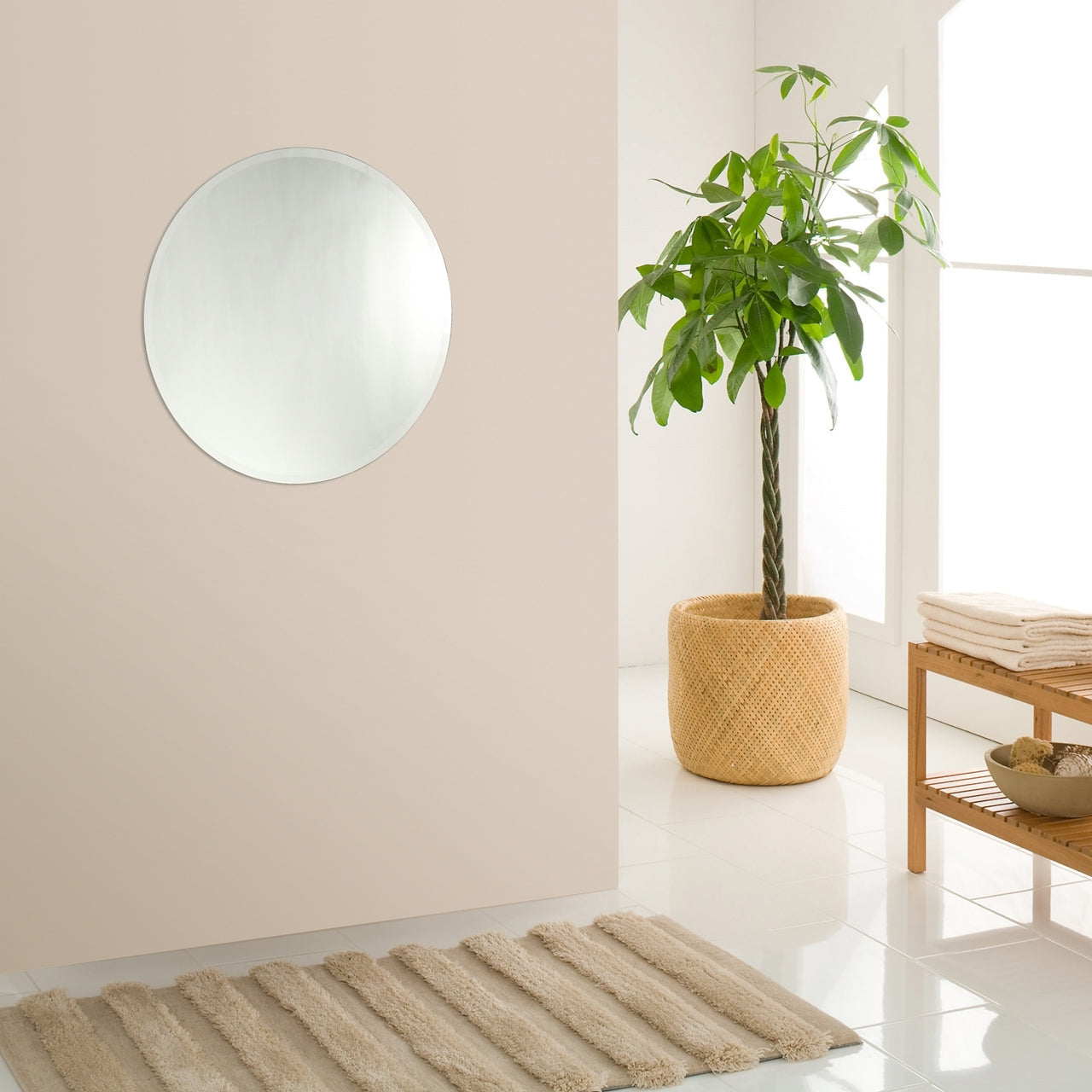 The Chloe Lighting Dodson 23" round frameless wall mirror offers a sleek, modern design with its beveled edge, making it a versatile addition to any room. Whether placed in a bathroom, hallway, or as part of a decorative centerpiece, its minimalist aesthetic complements various interior styles. The mirror's clarity and edge detailing enhance its visual appeal, providing both functionality and elegance to your space.