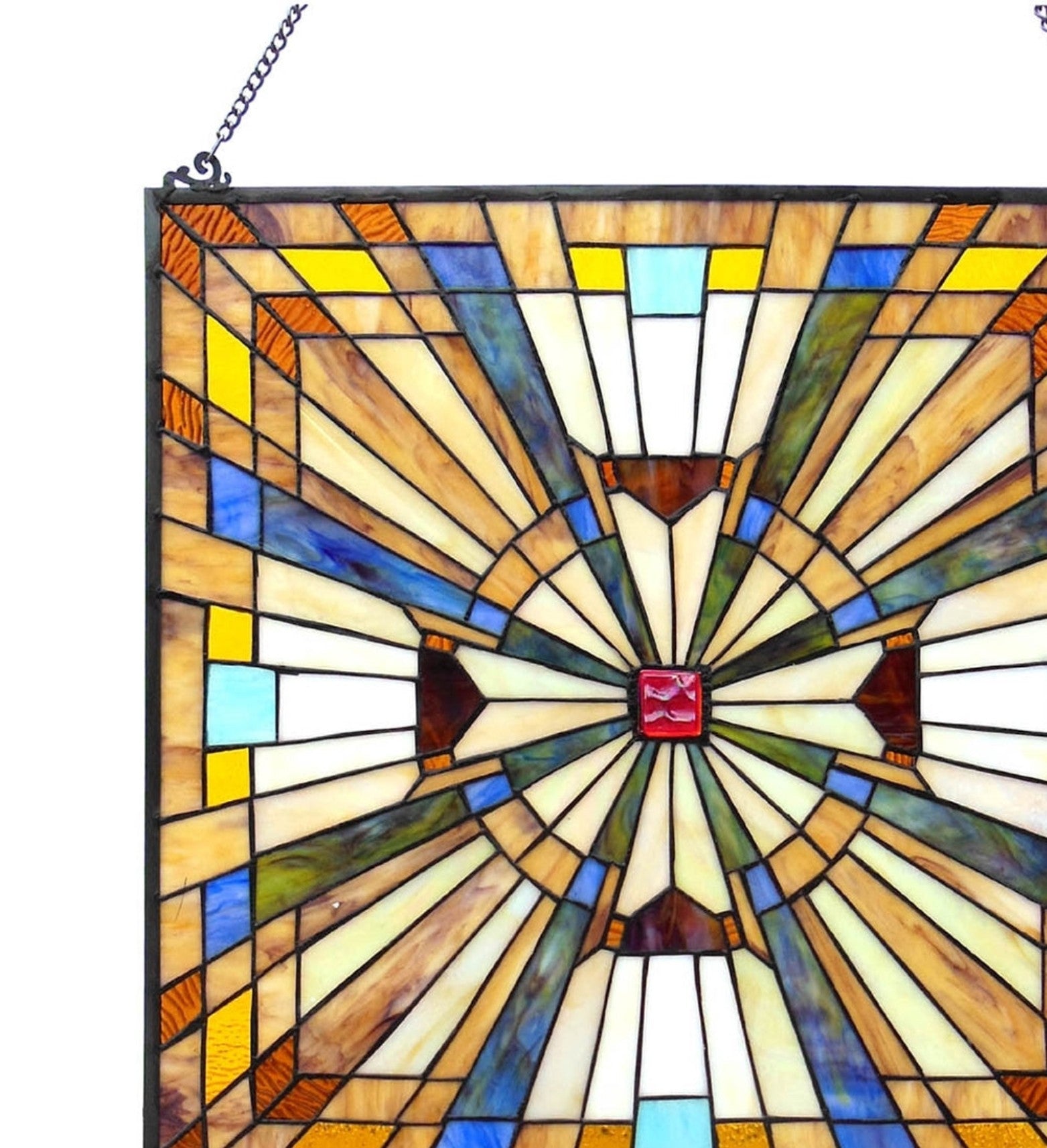 Bring a radiant burst of color and timeless elegance into your home with the Flare Mission-Style Window Panel. Featuring soothing pastel hues and symmetrical Victorian patterns, this handcrafted panel is made with real stained Tiffany-glass, sparkling crystals, and cabochons, offering an eye-catching focal point for any room. Housed in a sturdy metal frame with designer anchors and hanging chain included, this 24" square panel adds beauty and privacy to any window while catching light in dazzling ways.