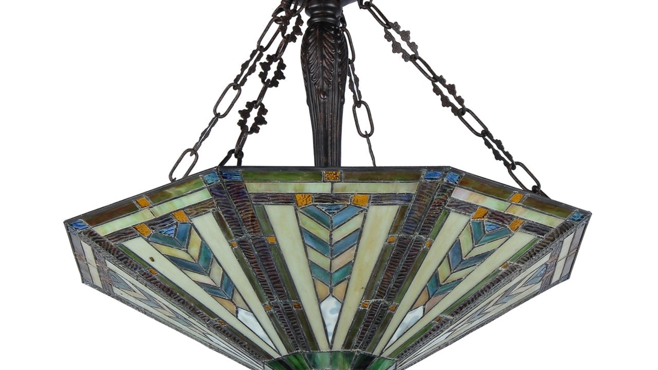 The Chloe Lighting Harrison Ceiling Pendant features a grand 25″ inverted stained glass shade in Victorian-Mission style. With a stunning mix of warm amber, green, and cream hues, this handcrafted Tiffany‑style fixture delivers beautiful ambient light, perfect for dining rooms, entryways, or large living spaces. The antique bronze-finished metal frame complements the shade’s rich tones, offering a timeless look with durable construction. Hardwired for a clean finish and compatible with three E26 medium-base bulbs (not included), the Harrison pendant combines artistry and functionality.