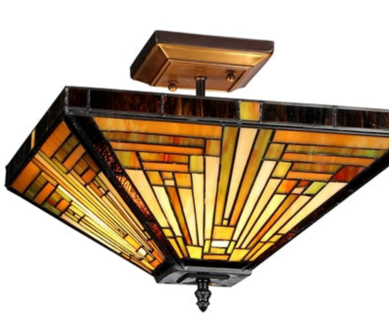 INNES, Tiffany-style mission ceiling mount fixture is handcrafted with intricate designs and made of pure stained glass piece. Distinctive design featuring rows and columns. Each piece accentuated one another to create a wonderful pallet of warmth. Coated in an antique bronze patina tone. Details abound from the base to the top anchor. Expertly crafted with top quality materials. Great addition to any office or home.
