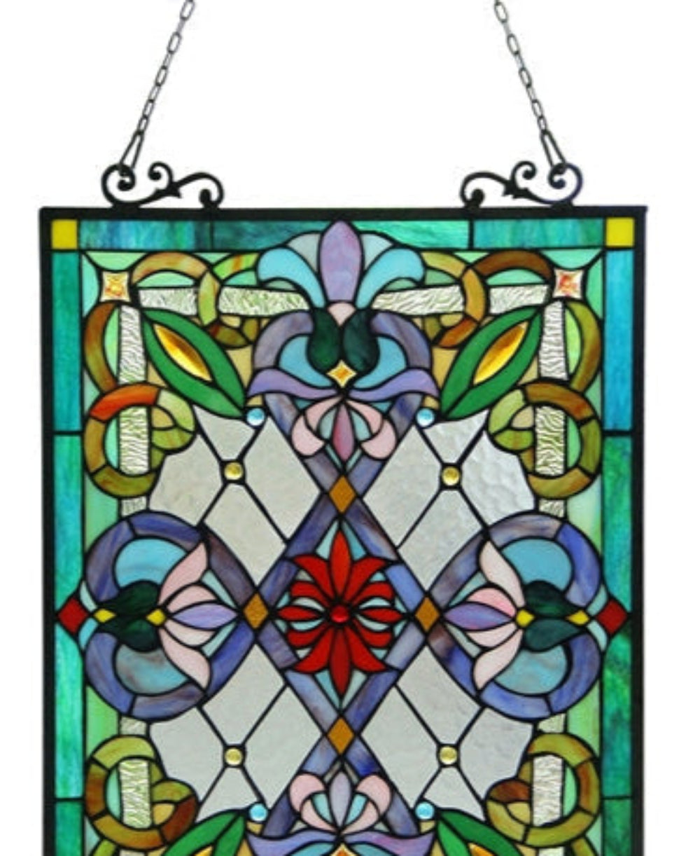 Design: Victorian-style stained glass featuring intricate patterns and vibrant colors. - Dimensions: 18 inches wide x 25.5 inches tall.