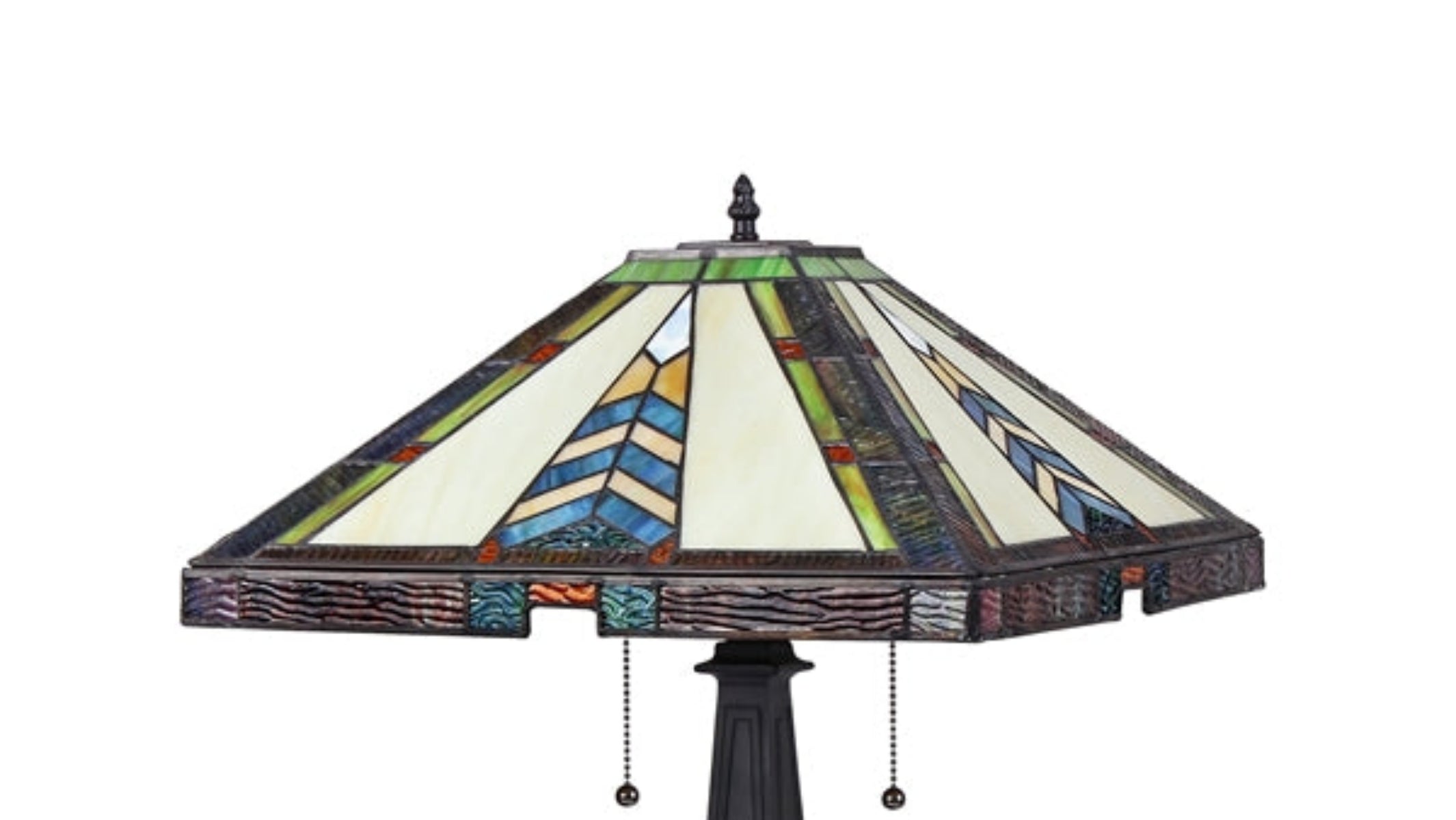 - Shade Material: 16″ Mission-style stained glass (amber/olive/bronze mosaic)