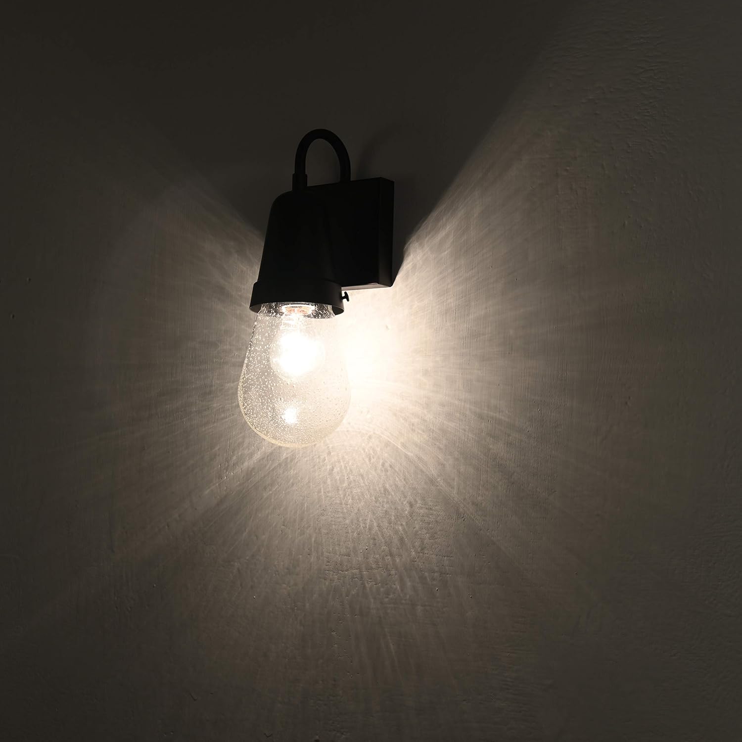 This is a uniquely shaped outdoor wall sconce, featuring a rubbed bronze fixture and a rain drop shaped, seedy glass globe. This wall scone would be wonderful to outline your home with! This transitional style wall sconce will definetely fit in on your home sweet home. The fixture takes one 100W bulb, and is compatible with incandescent, flourescent, and LED bulbs with an E26 base. All of our wall sconces are UL listed, and dry, damp and wet listed, to survive all weather conditions, hot and cold.